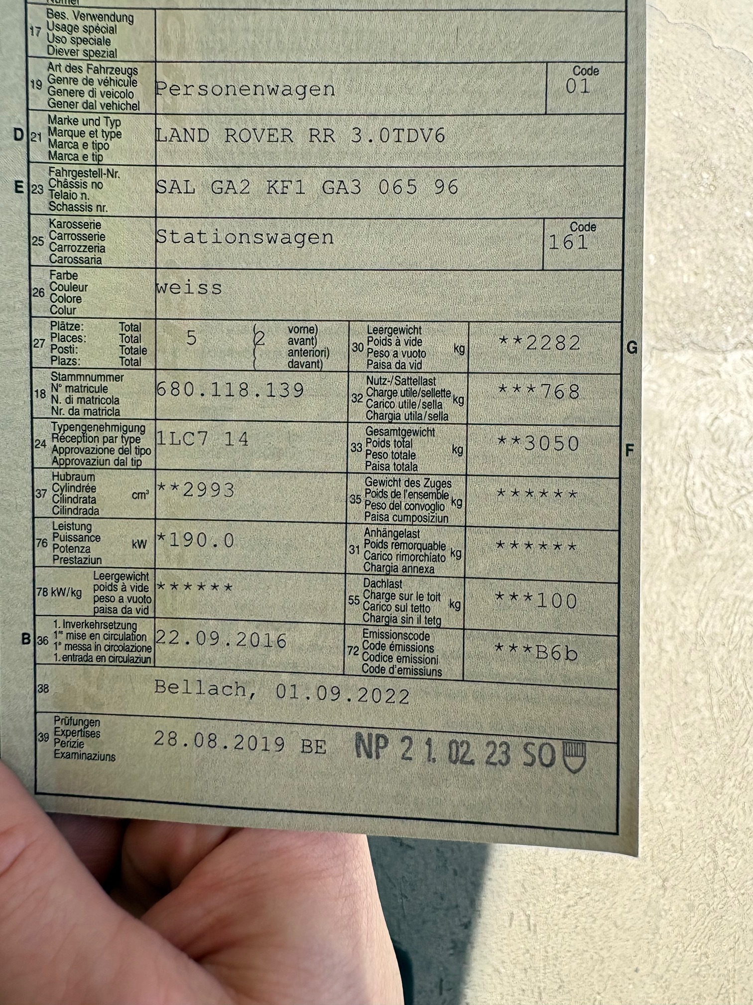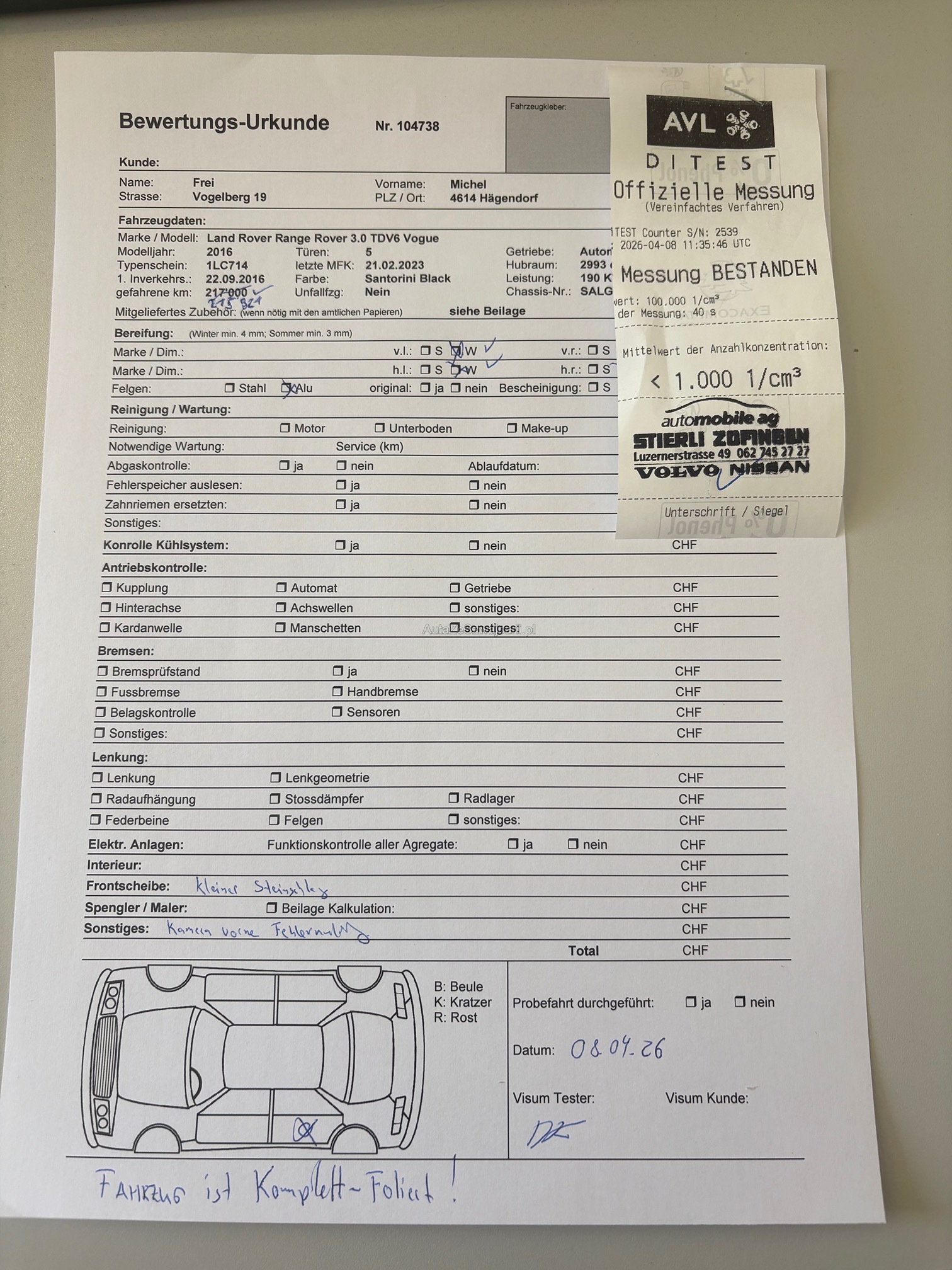 | Kommentar | Fahrzeug hat eine Komplett-Folierung (12'000.-) in weiss. Hinten links an der Türe kleiner Parkschaden (siehe Foto) Das Fahrzeug ist technisch in einwandfreiem Zustand. Es sind keine Mängel bekannt. DPF ist ok. Gemäss Kunde leuchtet sporadisch eine Warnlampe für den Frontsensor vorne in der Frontscheibe. Jede Gewährleistung wird wegbedungen insbesondere sind Wandlung und Minderung ausgeschlossen. Eine Garantie wird nicht gewährt. Preise werden nicht nach verhandelt. |