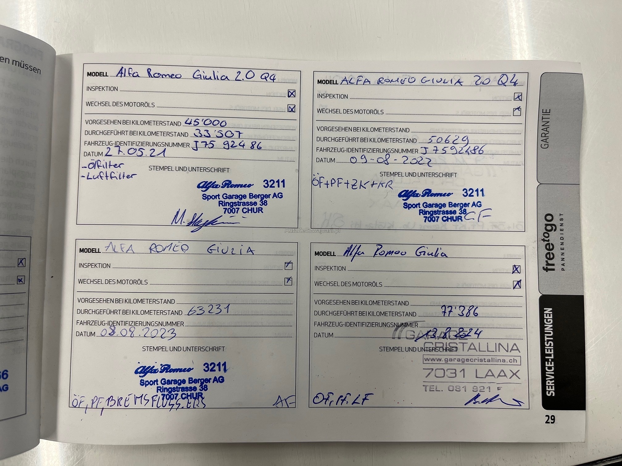 | Kommentar | Kunde möchte ein neues Fahrzeug ab Werk bestellen (Lieferfrist ca. 4-5 Monate) - darum Kilometerstand bei Übergabe nur ungefähr (keine Gewährleistung) Alfa aus 1. Hand - sehr gepflegt Carrosserie wird noch vor Verkauf von uns repariert (nur Parkschaden vorhanden) Sommerfelgen werden auch noch repariert und lackiert, Kunde hat jetzt 4 neue Continental Sport Contact 7 montiert (Mischbereifung), Motor hat Steuerkette |
