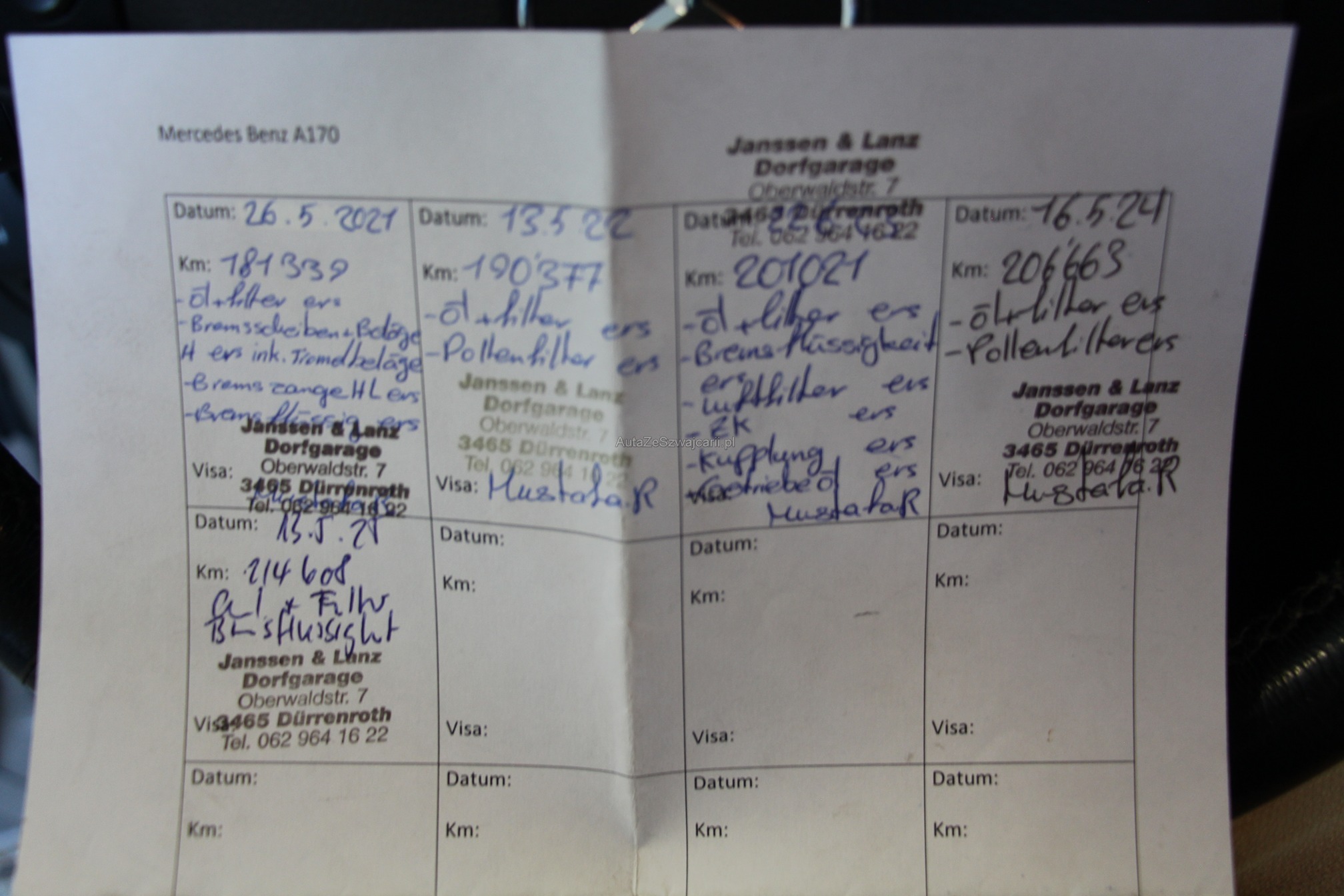 | Kommentar | Mercedes A170 Klima Zentralverriegelung Elektrische Fenster Parksensor DAB Radio CH-Fahrzeug 8 Fach Bereift Alufelgen Benzin Letzter Service : 5.2025 / 214608 Km Mängel : Hagelschaden !! MFK fällig !! Diverse grössere Gebrauchspuren aussen & innen !! Scheinwerfer matt !! Weitere Mängel sind nicht ausgeschlossen, kein Werkstatttest !! Am Fahrzeug wurde keine Prüfung der mechanischen Teile und der Carrosserie durchgeführt! Fahrzeug wurde nicht angeschaut !! Das Risiko liegt somit vollumfänglich beim Käufer. Nach Zuschlag keine Nachverhandlungen möglich. Kein Rückgaberecht |