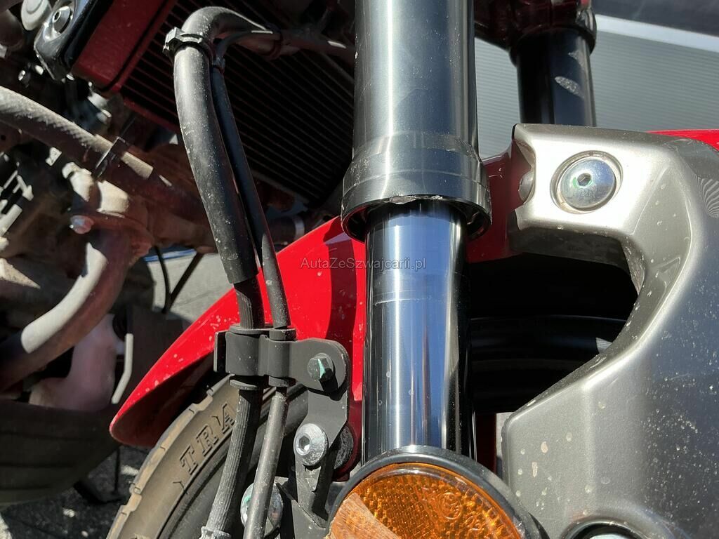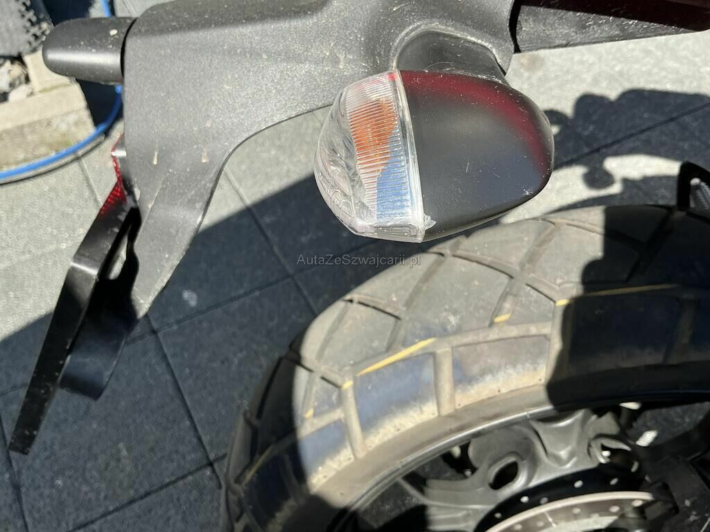 Pare-boue avant, phare avant, clignoteurs droit, fourreau de fourche avant droit, cache carter droit, rétroviseur, levier et poids de guidon droit, échappement, pédale de frein, cale pied droit, jante avant griffés. Guidon faussé.