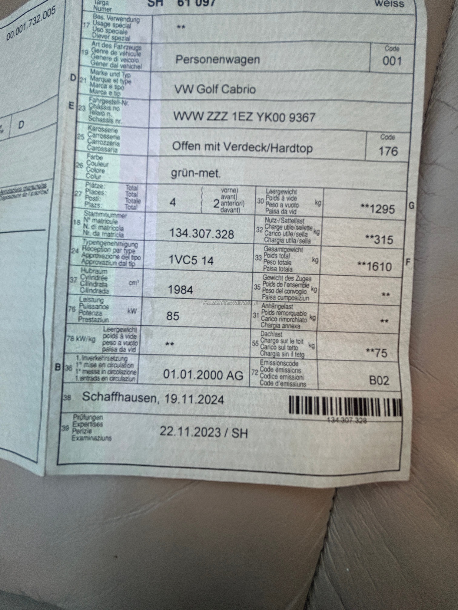| Kommentar | Das Fahrzeug kann weitere durch uns nicht bemerkte Mängel aufweisen und wird daher ab Platz und ohne jegliche Garantie und Gewährleistung verkauft. Es wurde durch uns nicht vollständig kontrolliert und weist diverse Gebrauchsspuren, Kratzer sowie Beulen gemäss Bildern auf. Das Fahrzeug ist nicht fahrbar. Bekannte Mängel sind: Getriebe defekt, Beulen, Kratzer, Innenraum abgenutzt. Es werden keine Nachverhandlungen geführt. Gerne können Sie das Fahrzeug vor Ihrem Gebot bei uns auf Voranmeldung besichtigen. |
