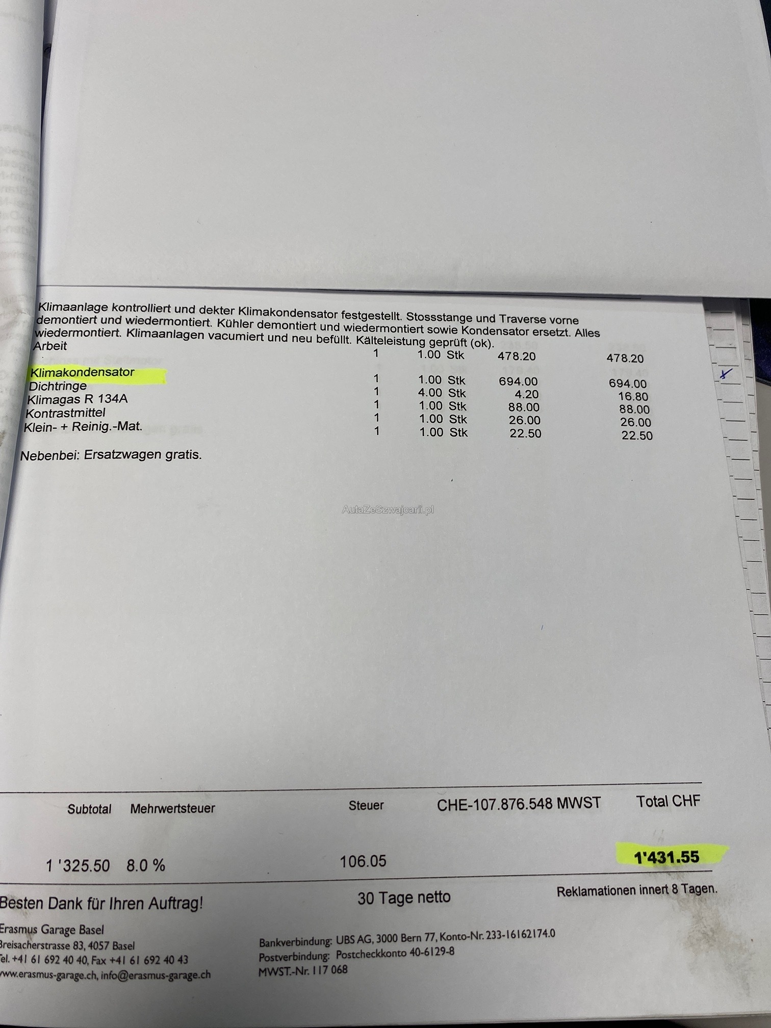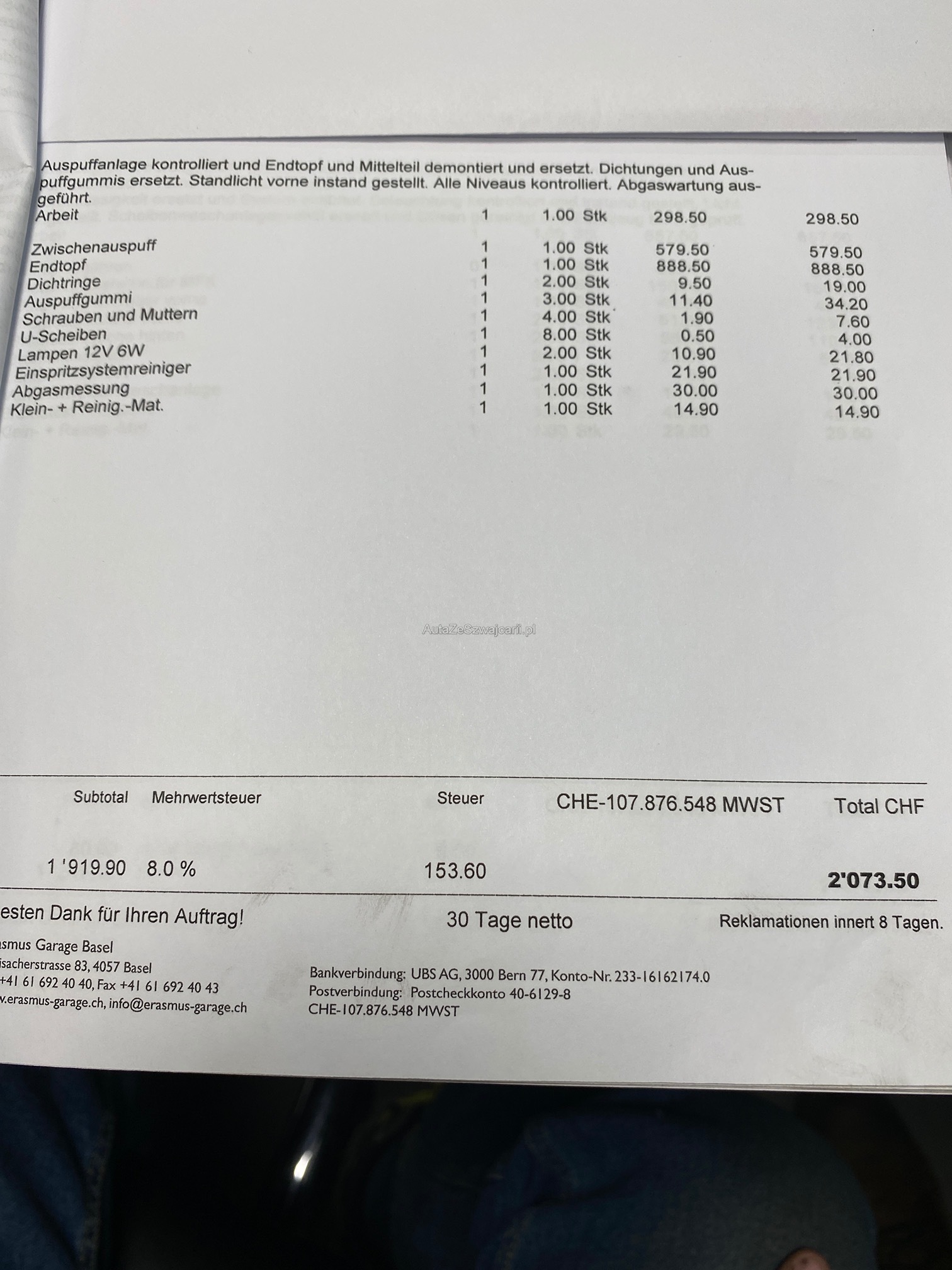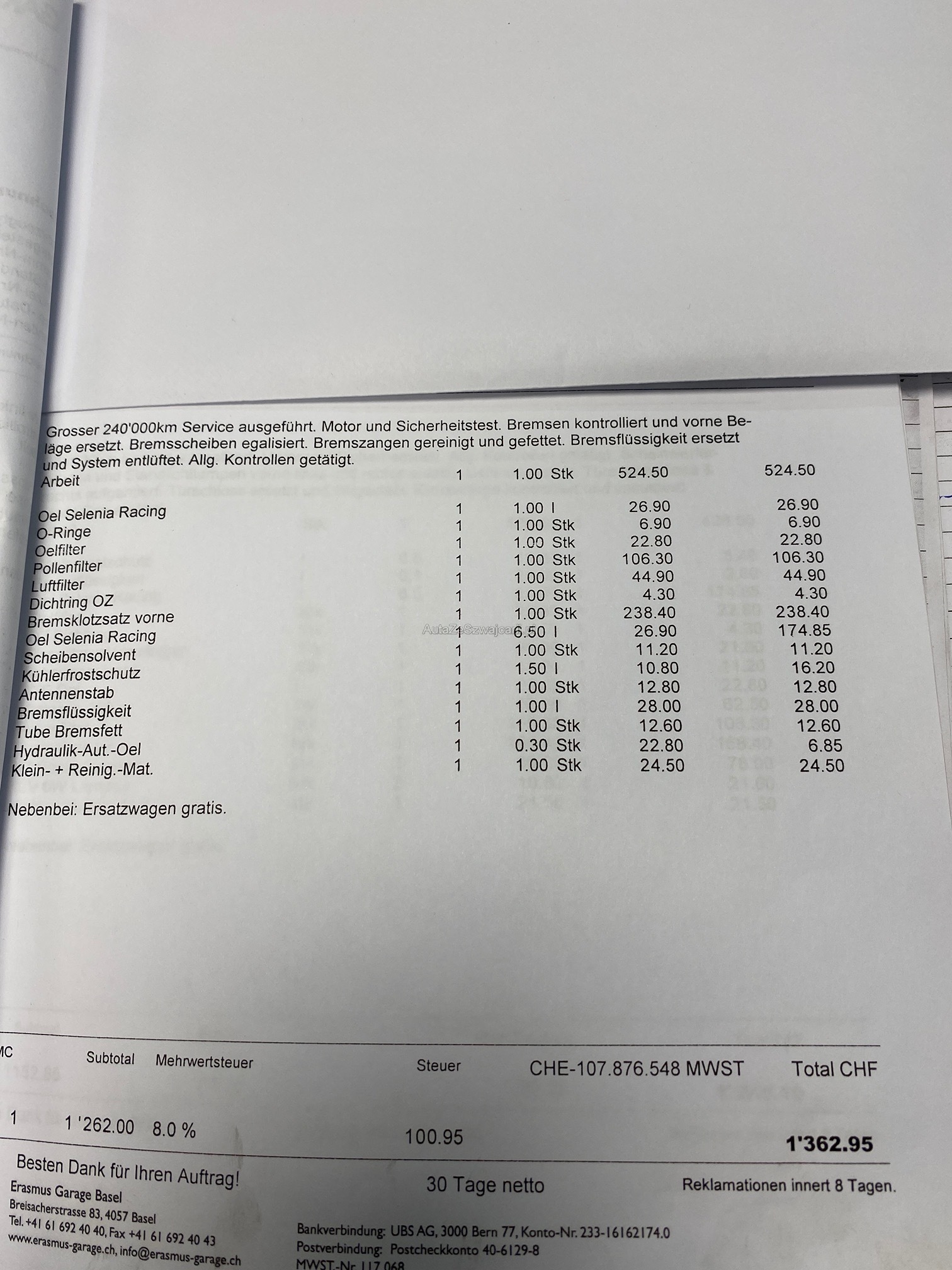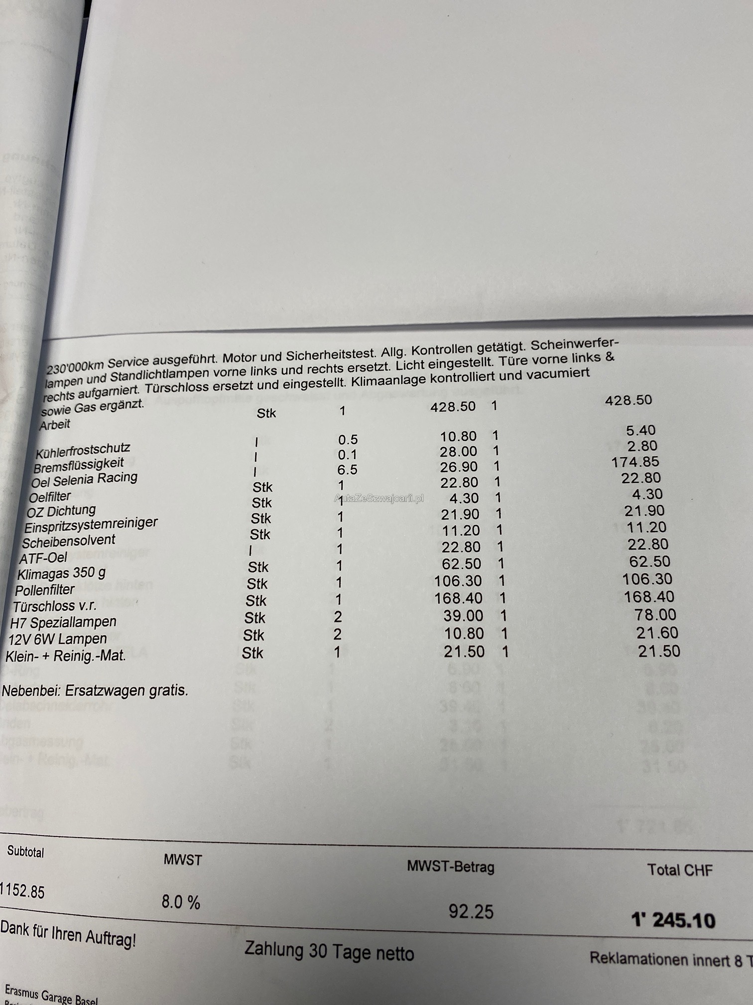 | Kommentar | Fahrzeug hat kleiner Hagelschaden. Zahnriemen muss ersetzt werden. Investitionen siehe Fotos! Keine mechanische Prüfung. Abholung innert 5 Tagen. Keine Nachverhandlung. Ab Platz und ohne Garantie. Wandelung und Minderung werden wegbedungen. Belege im Wert von Fr.38‘000 vorhanden und im Fahrzeug. |