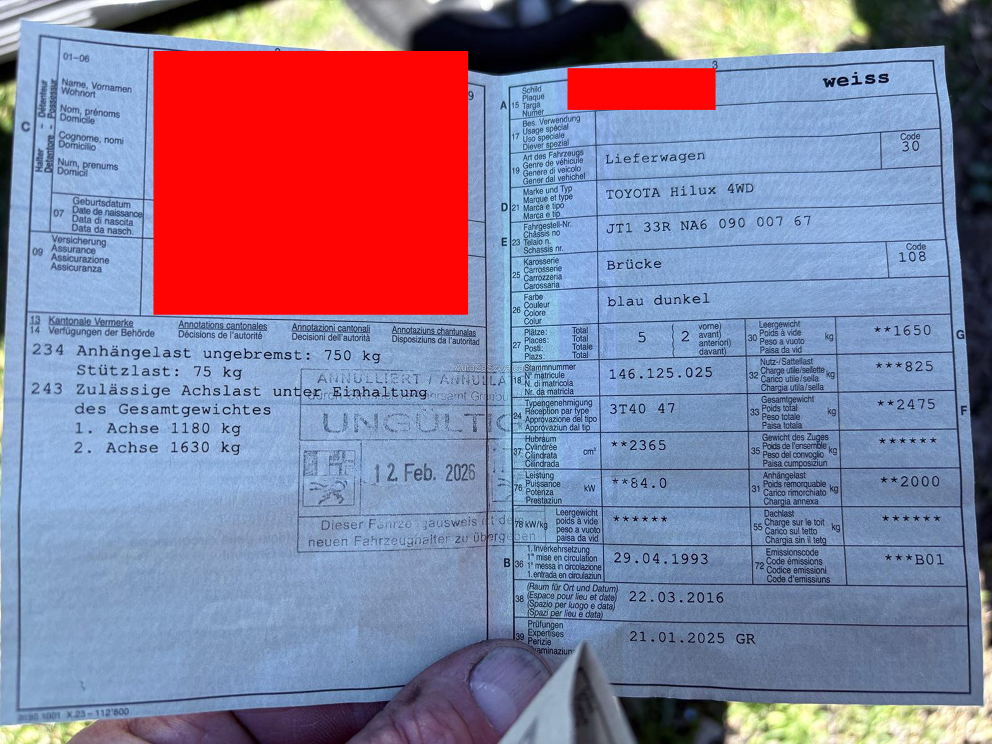 | Kommentar | Keine offensichtlichen Durchrostungen Hinweis: Das Fahrzeug wurde keinem Werkstatttest unterzogen. Eine Überprüfung sämtlicher Funktionen wurde nicht durchgeführt. Für sichtbare sowie nicht sichtbare Mängel wird keine Haftung übernommen. Der Verkauf erfolgt ab Platz, ohne Garantie oder Gewährleistung. Jegliche Ansprüche auf Wandelung oder Minderung werden ausdrücklich wegbedungen. Nach Zuschlag bzw. Kaufabschluss sind Nachverhandlungen ausgeschlossen, auch im Falle nachträglich entdeckter, nicht deklarierter Mängel. Das Risiko trägt vollumfänglich der Käufer. |