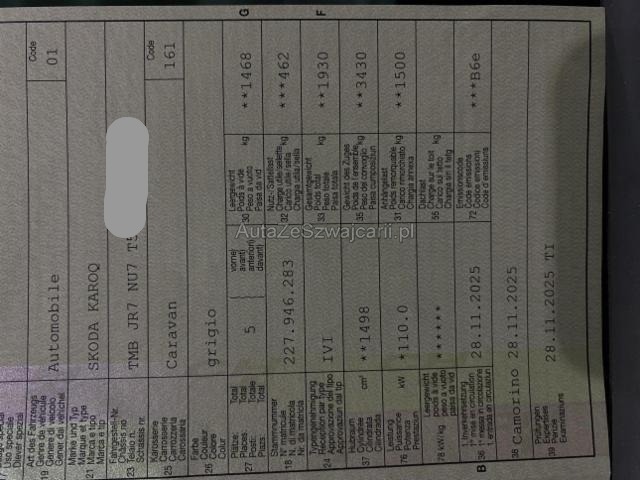 | Condition_and_Equipment | Bereifung Fahrzeug wird mit Winterräder abgegeben. Schlüssel Beide Schlüssel vorhanden. --- Links Tür vorne links ist eingedrückt. Front Fussgängerschutz ausgelöst. Front eingedrückt. Front links eingedrückt. Front rechts eingedrückt. Kotflügel vorne rechts eingedrückt. Kotflügel vorne links eingedrückt. Kotflügel vorne rechts und links eingedrückt. Motorhaube eingedrückt. Motor Motorschaden. Motoranbauteile beschädigt. Achse Aufhängungsteile vorne links beschädigt. Aufhängungsteile vorne rechts beschädigt. Risiko Lenkung. Elektrik Risiko Steuergeräte. Kabelstränge verbrannt, beschädigt, abgerissen. Risiko Scheinwerfer. Risiko Tagfahrleuchten. Innenraum Beide Airbags sind ausgelöst. Kopfairbag links ausgelöst. Kopfairbag rechts ausgelöst. Armaturenbrett ist beschädigt. Gurtstraffer vorne ausgelöst. Gurtstraffer hinten ausgelöst. Weitere Beschädigungen Der Motor läuft nicht (im Notfall?) --- Serienaustattung Airbag Fahrer und Beifahrerseite Innenspiegel automatisch abblendbar Reifendruck-Kontrollsystem RDK Kopf und Seitenairbag vorne Fussmatten vorne und hinten Park-Distanz-Sensor hinten Dachreling schwarz Nebelscheinwerfer vorne Regen- und Lichtsensor Knieairbag Fahrer Vordersitze höhenverstellbar Brillenfach Digitaler Radioempfang DAB HSA Berganfahrassistent Reifen-Pannenset Zwei Zonen-Klimaanlage Climatronic Adaptive Geschwindigkeitsregelung ACC Vorbereitung für Anhängerkupplung Leichtmetallfelgen 17" LED-Scheinwerfer LED Tagfahrlicht ESP/ ABS/ EBV/ MSR/ ASR/ EDS/ HBA/ DSR Aussenspiegel el.verstell-heiz-anklappbar/abblendbar Spurhalteassistent LDW Details siehe gültige Preisliste des Importeurs Keine Gewähr auf die Angaben der Serienausstattungen Keyless Start Multifunktionslenkrad Leder Front Assist (Umfeldüberwachungssystem) Garantieverlängerung für das 3. Jahr/ 100'000 km Verkehrsschild-Erkennungssystem SmartLink Care Connect 3 Jahr Müdigkeitserkennung Sonderausstattung Metallic-/ Perleffekt-Lackierung Anhängerkupplung mechanisch ausklappbar Heckklappe elektrisch mit Freihandfunktion Ausstattung Metallic-Lackierung |