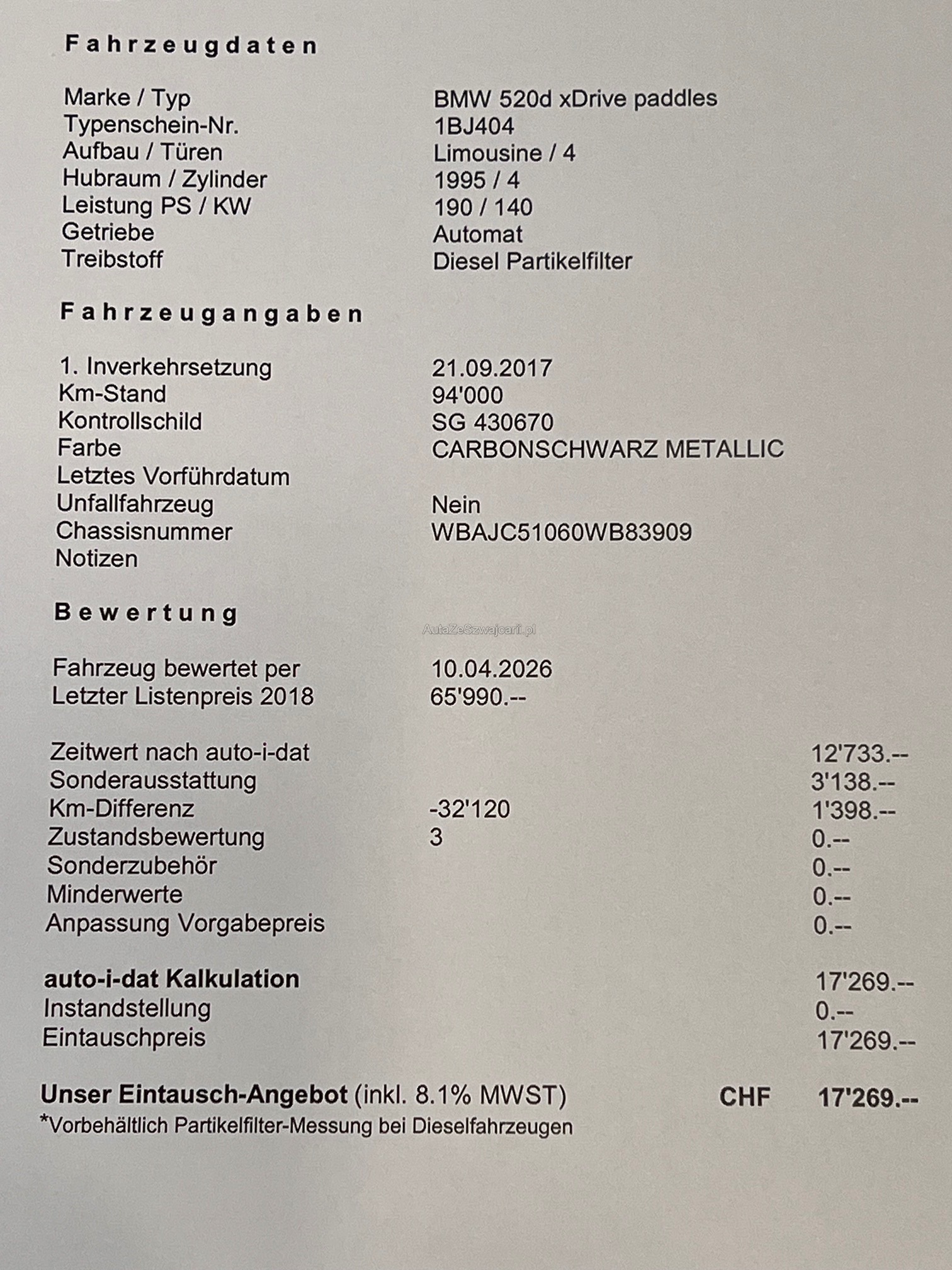 | Kommentar | Felgen leicht beschädigt, ein Kratzer und Scheinwerfer rechts verkratzt (siehe Fotos). Verkauf ausschliesslich ab Platz, Jede Gewährleistung, soweit nach Gesetz möglich, wird wegbedungen, insbesondere sind Wandelung und Minderung ausgeschlossen. Der technische Zustand ist unbekannt, das Fahrzeug wurde nicht geprüft. Zustand wie auf den Bildern, kann jedoch bei der Abholung abweichen. (z. B. Mängel, die uns nicht bekannt sind.) Sämtliche Mängel sind Sache des Käufers. Keine Rücknahme, keine Nachverhandlung, kein Preisnachlass. Kauf erfolgt wie gesehen. |