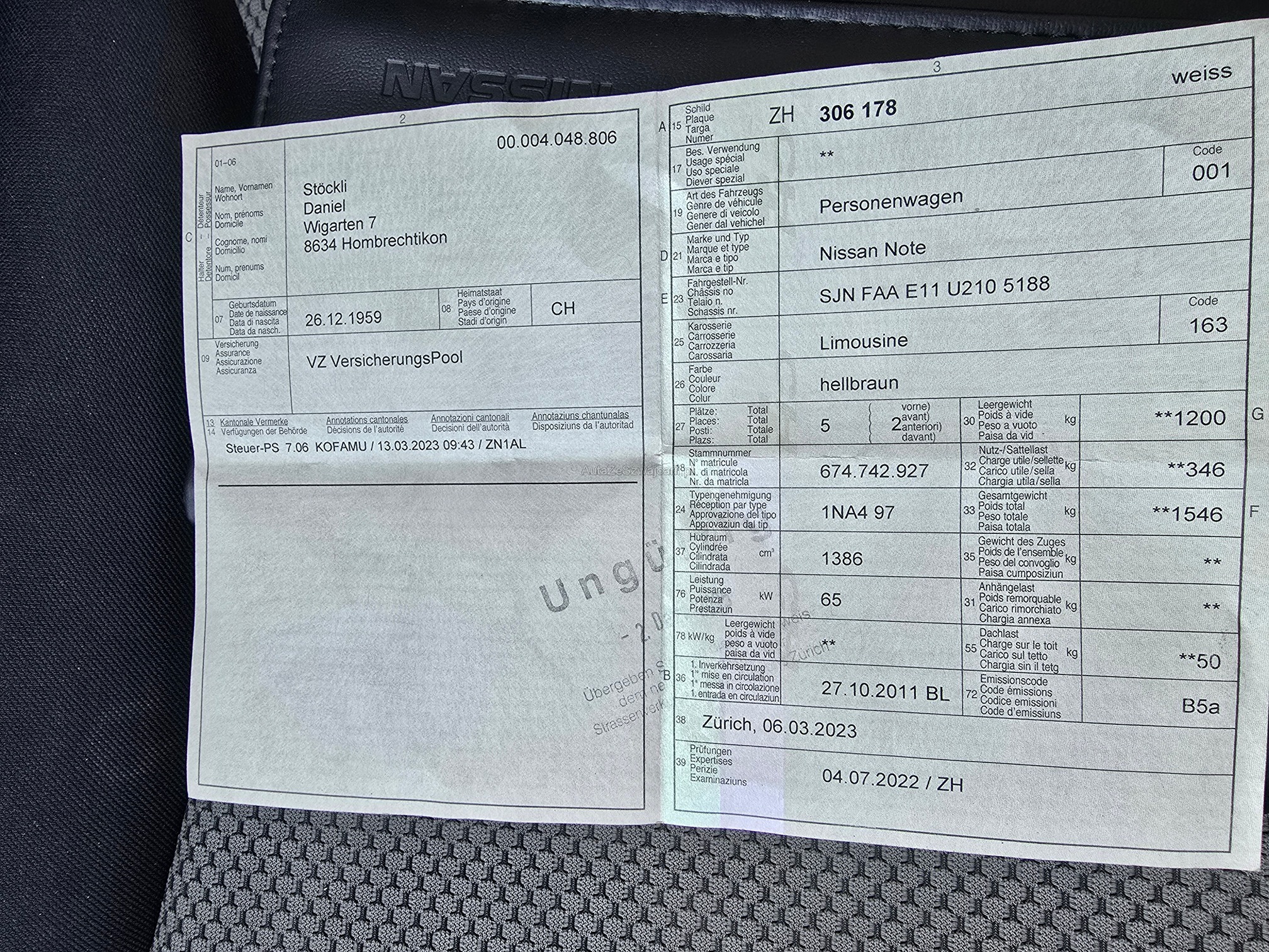| Kommentar | Nissan Note I-Way mit Top Ausstattung!! Motor Getriebe Kupplung i.O fährt soweit problemlos. Keine Mechanische und Technische Prüfung. Ab Platz ohne Garantie. Innen und Aussen stark gebraucht!! Diverse Carosserie Schäden Aussen ( siehe Bilder)!!! Fahrzeug muss innert 5 Tagen abgeholt werden. |