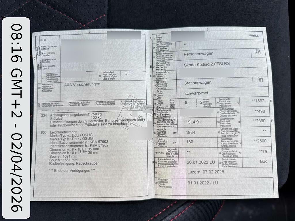 | Sonderausstattung | Paket: Schlafpaket (Sonnenschutzrollo für Seitenscheiben hinten - mechanisch, Sitze: 2 spezielle Kopfstütze hinten, 2 Decken, Teppichfussmatten Lounge Step), Paket: mySKODA Pack RS (Assist: Umgebungkamera "Area View", Sitze: Elektrisch einstellbare Vordersitze mit Memory, Lendenwirbelstütze elektrisch einstellbar (Entfall des Ablagefachs unter den Vordersitzen), Berührungsloses Öffnen der Heckklappe, Zweiter USB-Anschluss vorne und 1x USB-Anschluss hinten,Steckdose 230V, Media: Dynamisches Navigationssystem COLUMBUS 9.2"-Farb-Touchscreen, Festplatte, DAB+ Empfänger und Webradio, Sprachbedienung, "SmartLink", Kartenmaterial Europa, Infotainment Online 3 Jahre; Telefonvorbereitung mit Phonebox und Wireless Charging (Verbindung über die Aussenantenne), WLAN und LTE Antenne für High Speed Internet, Sitze: Rücksitzlehne mit Fernbedienung aus Kofferraum, Assist: Travel Assist High - Adaptiver «Lane Assist» - Parklenkassistent «Park Assist» - Predictive Cruise Control (PCC), Klima: Klimaanlage "Climatronic", 3-Zonen-Temperaturregelung, vollautomatisch, getrennt regelbar, Frontscheibenheizung inkl. Regensensor und Lichtassistent (Coming Home, Leaving Home, Tunnel Light)), Sitze: Vorder- und Rücksitze heizbar, Panorama-Schiebedach, Zusatzschlüssel, Airbag: Seitenairbags hinten, Lenkrad: 3-Speichen-Supersport-Leder-Multifunktionslenkrad mit Schaltwippen, beheizbar, Lackierung: Perleffekt-Lackierung, Anhängerkupplung, mechanisch anklappbar mit elektrischer Entriegelung, Räder: Leichtmetallräder 8,5 J x 20" "IGNITE",anthrazit mit polierter Oberfläche (RDKS), 255/40 R20 |