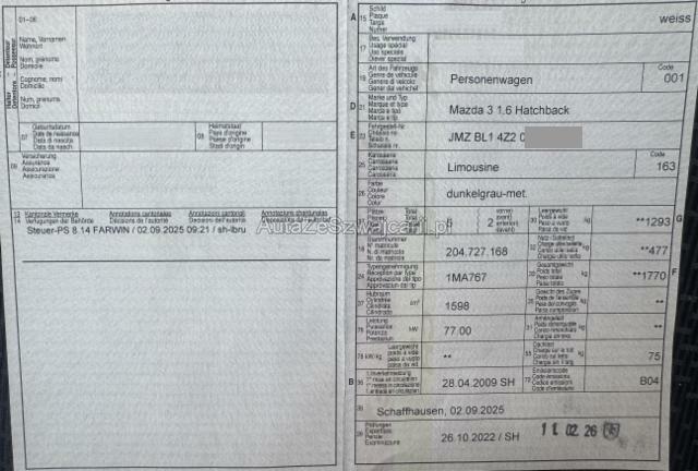 | Condition_and_Equipment | Schlüssel Nur ein Schlüssel vorhanden. --- Heck Heck links eingedrückt. Seitenwand hinten links eingedrückt/ausgestaucht. Sonstige Schäden Div.Carrosserie Teile sind leicht beschädigt. Div. Roststellen am Fahrzeug. Weitere Beschädigungen Schaden und Ausstattung gemäss beiliegenden Fotos --- Serienaustattung Klimaanlage Airbag Fahrer und Beifahrerseite Elektrische Fensterheber vorne + hinten Seitenairbag Fahrer und Beifahrerseite Zentralverriegelung mit Fernbedienung Lenkrad verstellbar Lederlenkrad mit Lederschaltknauf Aussenspiegel elektrisch verstellbar/ heizbar und anklappbar Bremsassistent EBA Audiofernbedienung am Lenkrad Vorhangairbags vorne + hinten Radio/ CD/ MP3 Isofix-Kindersitzbefestigung hinten Aussenspiegel und Türgriffe in Wagenfarbe ABS und EBD Elektr. Bremskraftverteilung Rücksitzlehnen getrennt abklappbar 60:40 Fahrersitz höhenverstellbar/ regulierbarer Kreuzstütze Multi-Informationsdisplay/ Bordcomputer DSC Dynamische Stabilitäts- und Traktionskontrolle TCS Keine Gewähr auf die Angaben der Serienausstattungen Sonderausstattung Metallic- oder Mica Lackierung Einparkhilfe hinten Ausstattung Rückfahrsensoren Tempomat Metallic-Lackierung |