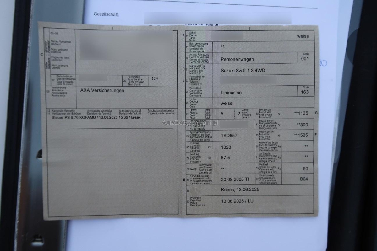 | Fahrzeugausweis | Vorhanden |