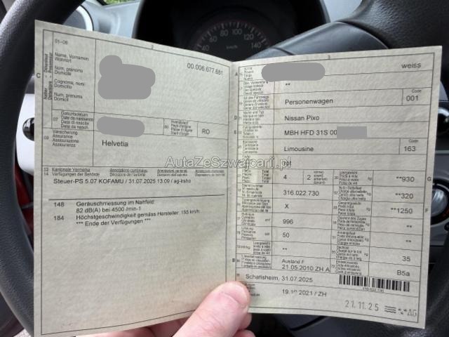 | Condition_and_Equipment | Zustand Fahrzeug ist fahrbar. Bereifung Fahrzeug wird mit Winterräder abgegeben. Schlüssel Nur ein Schlüssel vorhanden. Kategorie Das Fahrzeug wird vom Besitzer noch benutzt. --- Rechts Rechte Seite beschädigt. Anstoss rechts im Bereich der C-Säule. Schweller rechts ist eingedrückt. Tür hinten rechts ist eingedrückt. Heck Seitenwand hinten rechts eingedrückt/aufgestaucht. Achse Risiko Hinterachse. Sonstige Schäden Div.Carrosserie Teile sind leicht beschädigt. Lackierung matt (stumpf, beschädigt). Weitere Beschädigungen Stossfänger hinten. Schaden vorne links. --- Serienaustattung Airbag Fahrer und Beifahrerseite Elektronische Wegfahrsperre Seitenairbag Fahrer und Beifahrerseite Lenkrad verstellbar ABS und EBV Elektr. Bremskraftverteilung inkl. BA Servolenkung elektrisch Isofix-Kindersitzbefestigung hinten Rücksitzbank umklappbar Stahlfelgen 14" Details siehe gültige Preisliste des Importeurs Keine Gewähr auf die Angaben der Serienausstattungen Notrad |