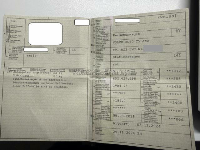 | Condition_and_Equipment | Zustand Fahrzeug ist NICHT fahrbar. Sonstiges Fahrzeugdokumente vorhanden. Schlüssel Nur ein Schlüssel vorhanden. --- Rechts Rechte Seite beschädigt. Anstoss rechts im Bereich der A-Säule. Anstoss rechts im Bereich der B-Säule. Anstoss rechts im Bereich der C-Säule. Tür vorne rechts ist eingedrückt. Tür hinten rechts ist eingedrückt. Front Front rechts eingedrückt. Kotflügel vorne rechts eingedrückt. Motor Risiko Motor. Risiko Getriebe. Risiko Differenzial. Achse Aufhängungsteile vorne rechts beschädigt. Risiko Vorderachse. Risiko Hinterachse. Risiko Lenkung. Elektrik Risiko Steuergeräte. Innenraum Seitenairbag rechts ausgelöst. Gurtstraffer ausgelöst. Gurtstraffer vorne ausgelöst. Dachhimmel gerissen. Sonstige Schäden Div.Carrosserie Teile sind leicht beschädigt. Weitere Beschädigungen - Risiko Gurtstraffer-Airbagmodule - Risiko Vorderachse, Rad vorne rechts lose - Türkanten teilweise vom öffnen Lackschaden - Risiko - Motor startet, Fehlermeldung gem. Foto - Reparaturkosten nicht abschliessend --- Serienaustattung Airbag Fahrer und Beifahrerseite Elektrische Fensterheber vorne + hinten Aussenspiegel elektrisch verstellbar und heizbar Tempomat Bordcomputer Zentralverriegelung mit Fernbedienung Lederlenkrad Lenkrad verstellbar Höhenverstellbare Vordersitze elektrisch SIPS Kopf-/ Schulterairbag Lederschalthebel Dachreling Alu Deaktivierung Beifahrerairbag Antibeschlagssensor Zwei Zonen-Klimaautomatik Mittelarmlehne vorne mit Staufach Laderaumrollo IDIS Fahrerinformationssystem WHIPS Schleudertrauma-Schutzsystem Regen- und Lichtsensor SIPS Seitenairbag Fahrer und Beifahrerseite Knieairbag Fahrer Hill Descent Control HDC ABS und EBD Elektr. Bremskraftverteilung Automatische Parkbremse Berganfahrhilfe Aktivkohlefilter mit automatischer Umluftschaltung Einparkhilfe hinten Leichtmetallräder 18" 5-Doppelspeichen Reifendruck-Sensoren TPMS Polsterung Textil/ T-Tec Stop + Start System Spurhalteassistent LKA Audiosystem High Performance Keine Gewähr auf die Angaben der Serienausstattungen DAS Driver Alert/ Assistenzsystem Lendenwirbelstützen elektr. für Vordersitze VSP Volvo Swiss Premium Verkehrsschild-Erkennungssystem City Safety inkl. Kreuzungsbremsassistent Volvo On Call VOC inkl. WiFi Hotspot LED-Scheinwerfer mit Fernlichtassistent ESC Fahrdynamikregelung Sonderausstattung Metallic-Lackierung Einparkhilfe vorne und hinten Komfortsitze mit Lederbezug LED-Scheinwerfer mit Fernlichtassist. + aktivem Kurvenlicht |