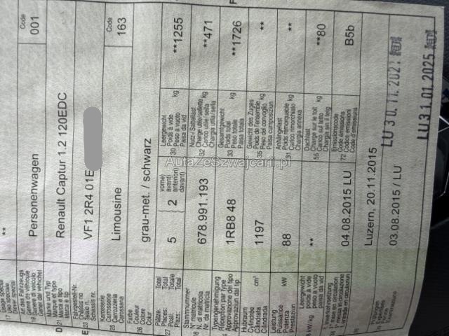 | Condition_and_Equipment | Zustand Fahrzeug ist NICHT fahrbar. Bereifung Fahrzeug wird mit Winterräder abgegeben. Sonstiges Fahrzeugdokumente vorhanden. Schlüssel Nur ein Schlüssel vorhanden. --- Front Front eingedrückt. Kotflügel vorne rechts eingedrückt. Motorhaube eingedrückt. Frontblech/Maskenblech eingedrückt. Elektrik Risiko Scheinwerfer. Risiko Nebellampen. Risiko Tagfahrleuchten. Sonstige Schäden Div.Carrosserie Teile sind leicht beschädigt. Weitere Beschädigungen Risiko Kühler Scheibenwaschbehälter ausgelaufen --- Serienaustattung Airbag Fahrer und Beifahrerseite Elektrische Fensterheber vorne Aussenspiegel elektrisch verstellbar und heizbar Nebelscheinwerfer Lederlenkrad Lenkrad verstellbar Elektrische Fensterheber hinten ABS und EBV Elektr. Bremskraftverteilung Deaktivierung Beifahrerairbag Pack Colour Isofix-Kindersitzbefestigung Not-Bremsassistent mit Aktivierung der Warnblinkanlage Seitenairbags vorne ESP/ ASR/ CSV Tempomat mit Geschwindigkeitsbegrenzer Ersatzrad Dunkle Verglasung hinten Elektrische variable Servolenkung Keyless-Drive Hands-free Höhenverstellbarer Fahrersitz HSA Berganfahrassistent Rücksitzlehne geteilt 1/3 oder 2/3 / umklappbar Klimaanlage automatisch inkl. Pollenfilter Licht- und Regensensor Reifenreparatur-Kit LED Tagfahrlicht Leichtmetallfelgen 17" schwarz Details siehe gültige Preisliste des Importeurs Dach in Kontrastfarbe Keine Gewähr auf die Angaben der Serienausstattungen Renault Media-Nav Sitzhüllen abnehmbar Sonderausstattung Metallic-Lackierung 4 Winterräder 16" Stoffinterieur Aussenspiegel elektrisch einklappbar Einparkhilfe hinten mit Rückfahrkamera |