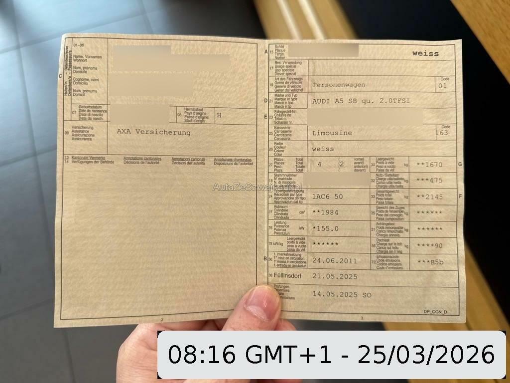 | Sonderausstattung | Media: Bluetooth-Schnittstelle, Alu-Räder 9Jx20 im 7-Doppelspeichen - Design, Aussenspiegel in Wagenfarbe, Innenspiegel automatisch abblendbar, Polster: Lederpaket, Multifunktions-Sportlederlenkrad mit Schaltwippen, Assist: Audi hold assist, Park Distance Control hinten, Licht- und Regensensor, Klima: 3-Zonen-Klimatisierungsautomatik, Abschliessbare Radschrauben, Lichtpaket, Audi Sound System, Park Distance Control vorne und hinten, S line Exterieurpaket, Gepäckraumpaket, Garantie: 5 Jahre oder 100'000 km (ab 1. Inv.), Metallic-Lackierung, Mittelarmlehne vorne, mit aufklappbarem Staufach, zwei 12V Steckdosen, Aussenspiegel elektrisch einklappbar, S-Line Sportfahrwerk, Vordersitze elektrisch verstellbar mit Lendenwirbelstütze |