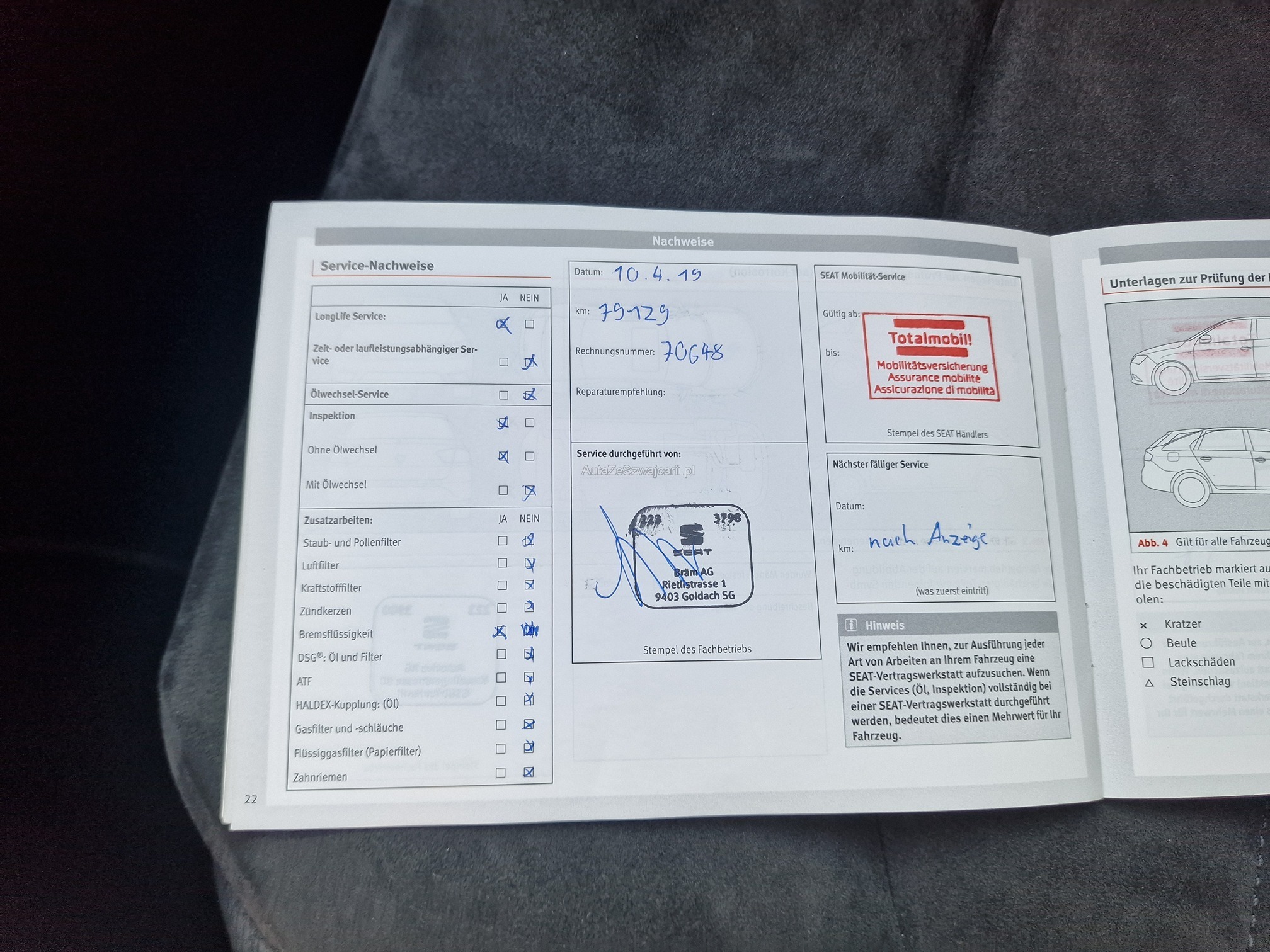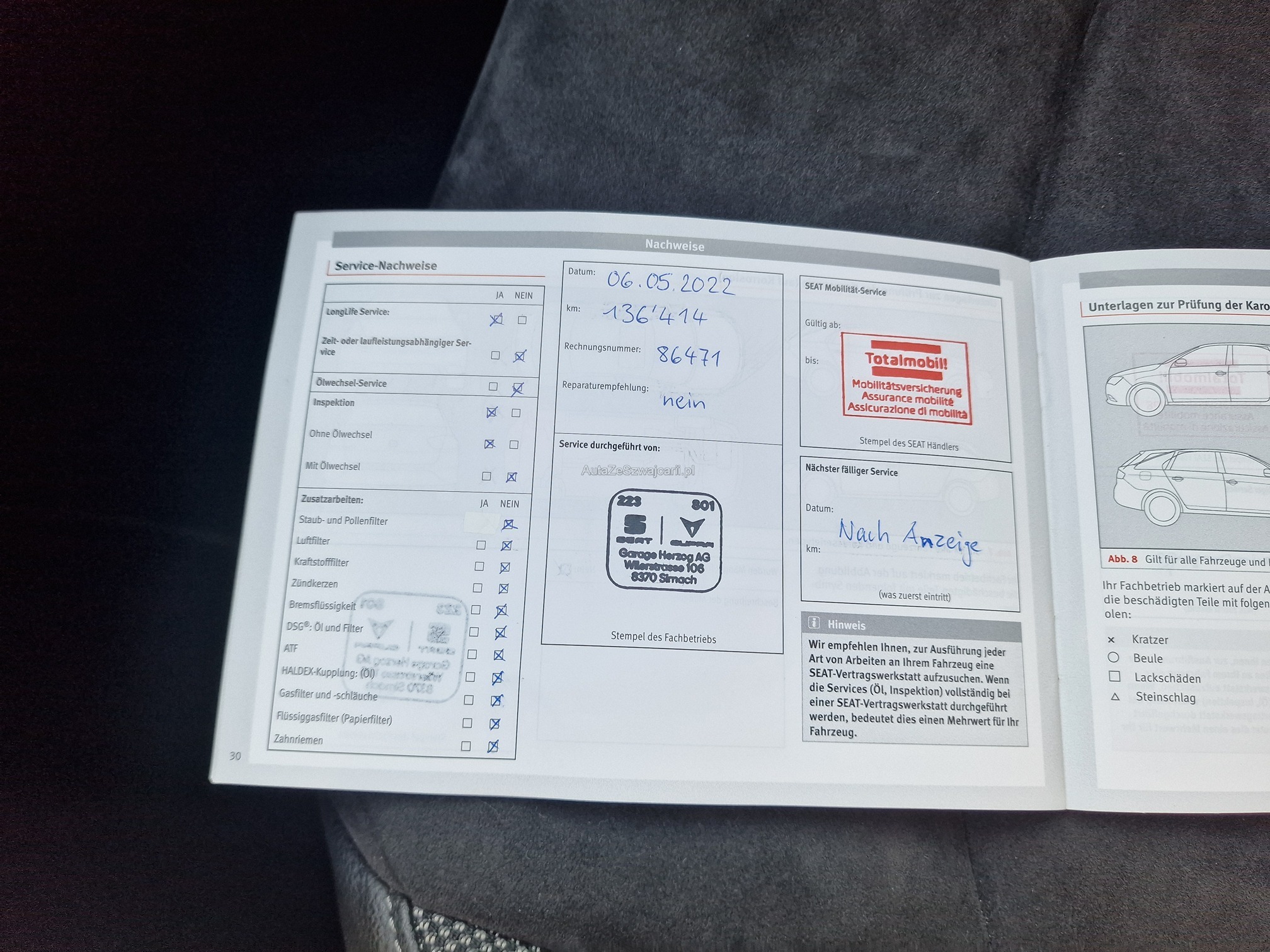 | Kommentar | - Aussen und Innen Gebrauchsspuren gemäss Fotos (Steinschlag Frontscheibe, Flugrost, Kratzer, Gitter vorne) - Fahrzeug noch im Kundenbesitz - Kein Eintauschtest / Diagnose durchgeführt - keine Nachverhandlung und / oder Nachwährschaft |