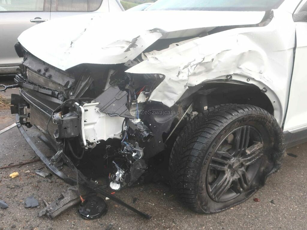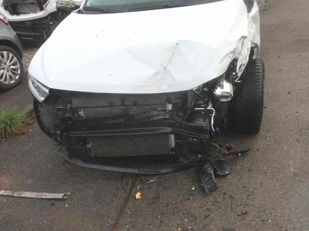 Toute la partie frontale, le train avant gauche et la porte avant droite sont endommagés. Les airbags frontaux et latéraux sont déployés.