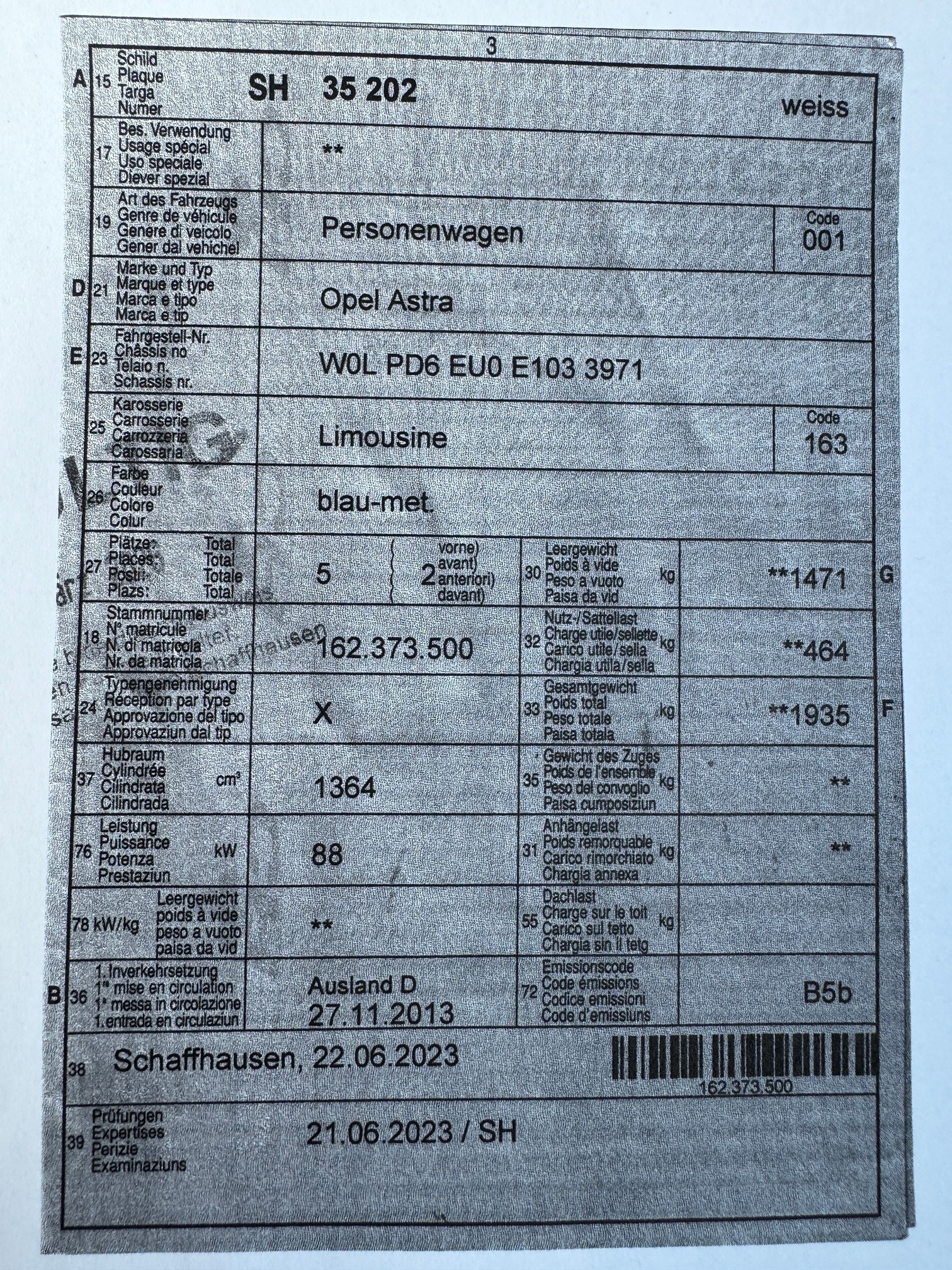 | Kommentar | Eintauschfahrzeug mit diversen Beulen und Kratzern. Bremsen hinten neu. Fahrzeug muss gereinigt werden. Der Opel fährt gut. Es wurde keine technische Kontrolle auf der Hebebühne durchgeführt |
