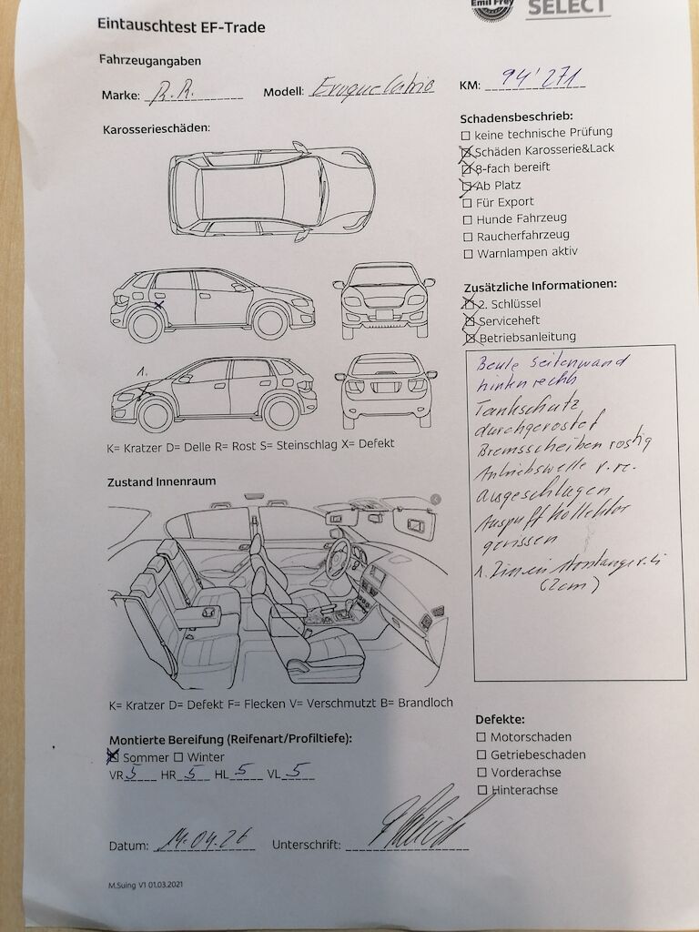 | Information | Keine technische Prüfung (Werkstatttest) vorgenommen Diverse Schäden an Karosserie/Lack. 8-fach bereift. Fahrzeug ab Platz, ohne Garantie und Aufbereitung. DPF/FAP Filter nicht kontrolliert Beule Seitenwand hinten rechts Tankschutz durchgerostet Bremsscheiben rostig Antriebswelle vorne rechts ausgeschlagen Auspuffkollektor gerissen Riss in Stossstange vorne links (2cm) |