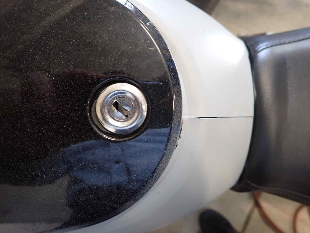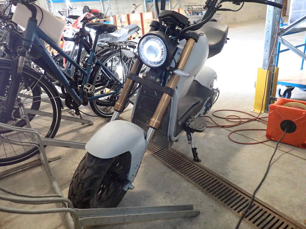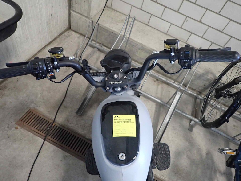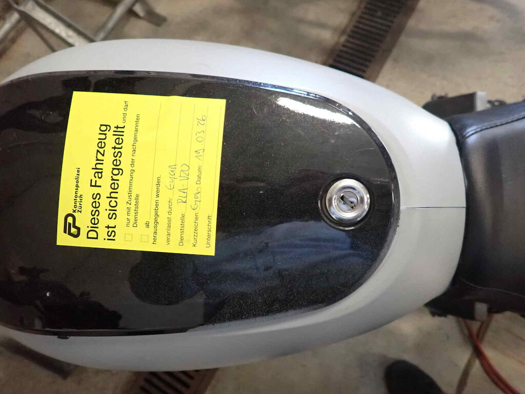 Einbruchspuren an den Schlösser Zündschloss, Handschuhfach und Batteriekasten. Die Schwinge HR weist einen Lackschaden auf. Der gesamte roller wurde in sehr schlechte Qualität auf grau umlackiert