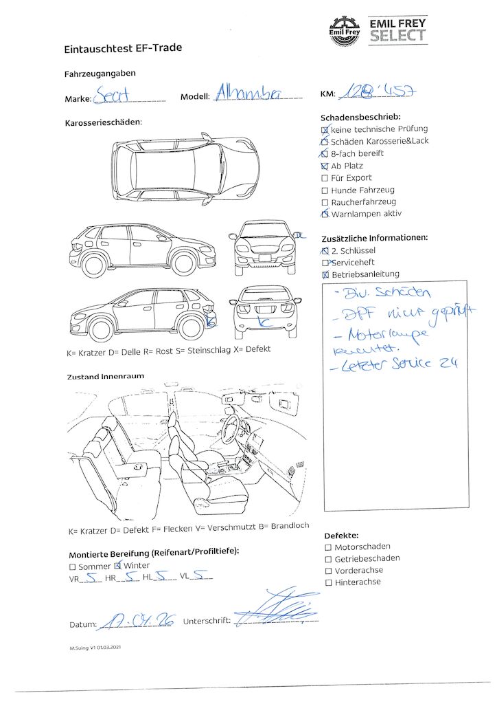 | Information | eine Gewähr auf die Angaben der Sonder- und Serienausstattung / keine mechanische Prüfung. Fahrzeug wurde unzerlegt expertisiert / keine Haftung für allfällige, nach Demontage bekanntwerdenden Mängel. Fahrzeugbereifung und Ausstattung gemäss Fotos / Fahrzeugkauf auf eigenes Risiko ab Platz ohne Nachwährschaft - Div. Dellen und Kratzer am gesamten Fahrzeug. - Motorlampe leuchtet, Ursache unbekannt. - Letzter Service 2024 |