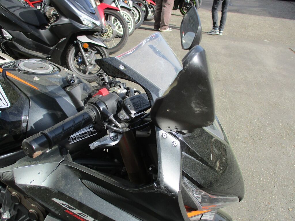 Das MR kam auf die rechte Seite zu liegen. Die Verschalungen vorne und hinten sind gebrochen. Der Benzintank ist eingedrückt. Der Motordeckel R und der Auspuff sind angeschürft. Der Lenkerstummel R , die Bremsanlage Vorne und die Fussraster R sind beschädigt. Der Lenkanschlag hat einen starken Schal erlitten, ist aber noch fix.