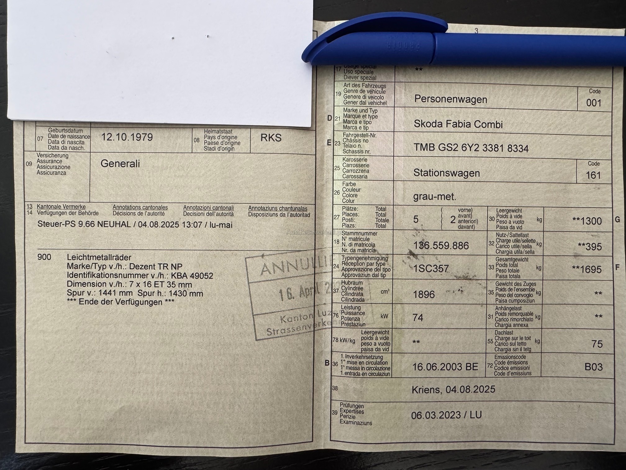 | Kommentar | Fahrzeug läuft einwandfrei. Motor und Getriebe i.O. Zustand Siehe Fotos. Am Fahrzeug wurde kein Werkstatttest gemacht (Für sichtbare oder nicht sichtbare Mängel wird nicht gehaftet). Wir testen & kontrollieren nicht alle Funktionen vom Fahrzeug. Das Risiko liegt somit vollumfänglich beim Käufer. Nachdem der Höchstbietende den Zuschlag erhalten hat, gibt es keine Nachverhandlung, auch wenn nicht deklarierte Mängel zum Vorschein kommen sollten. Ab Platz ohne Garantie, Wandelung und Minderung werden wegbedungen. Abholung nach Zuschlag innert 3 Tagen. |