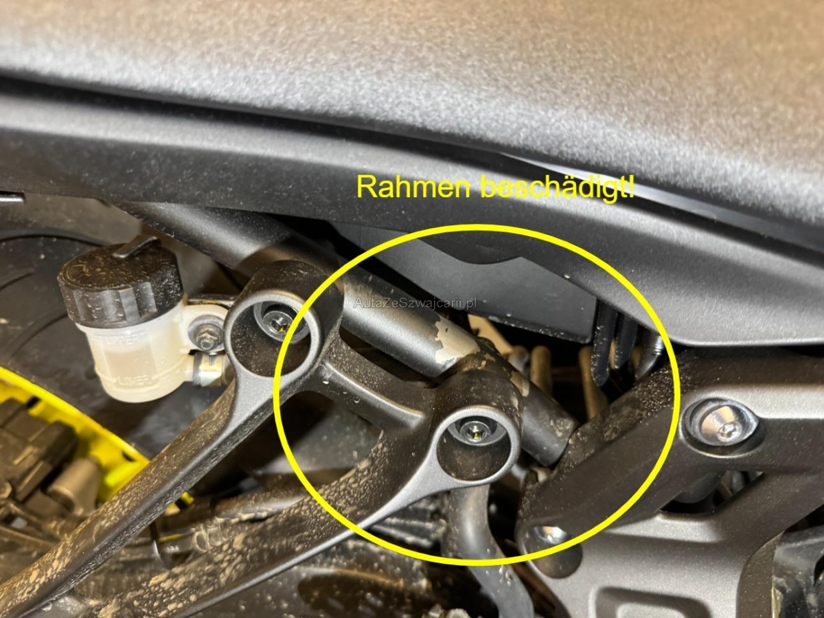 | Beschädigungen | Auspufftopf, Aussenspiegel links, Aussenspiegel rechts, Gabelholm, Griff links, Griff rechts, Lenker, Rad vorne, Rahmen, Schwinge, Seite rechts, Verschalungen links, Verschalungen rechts |