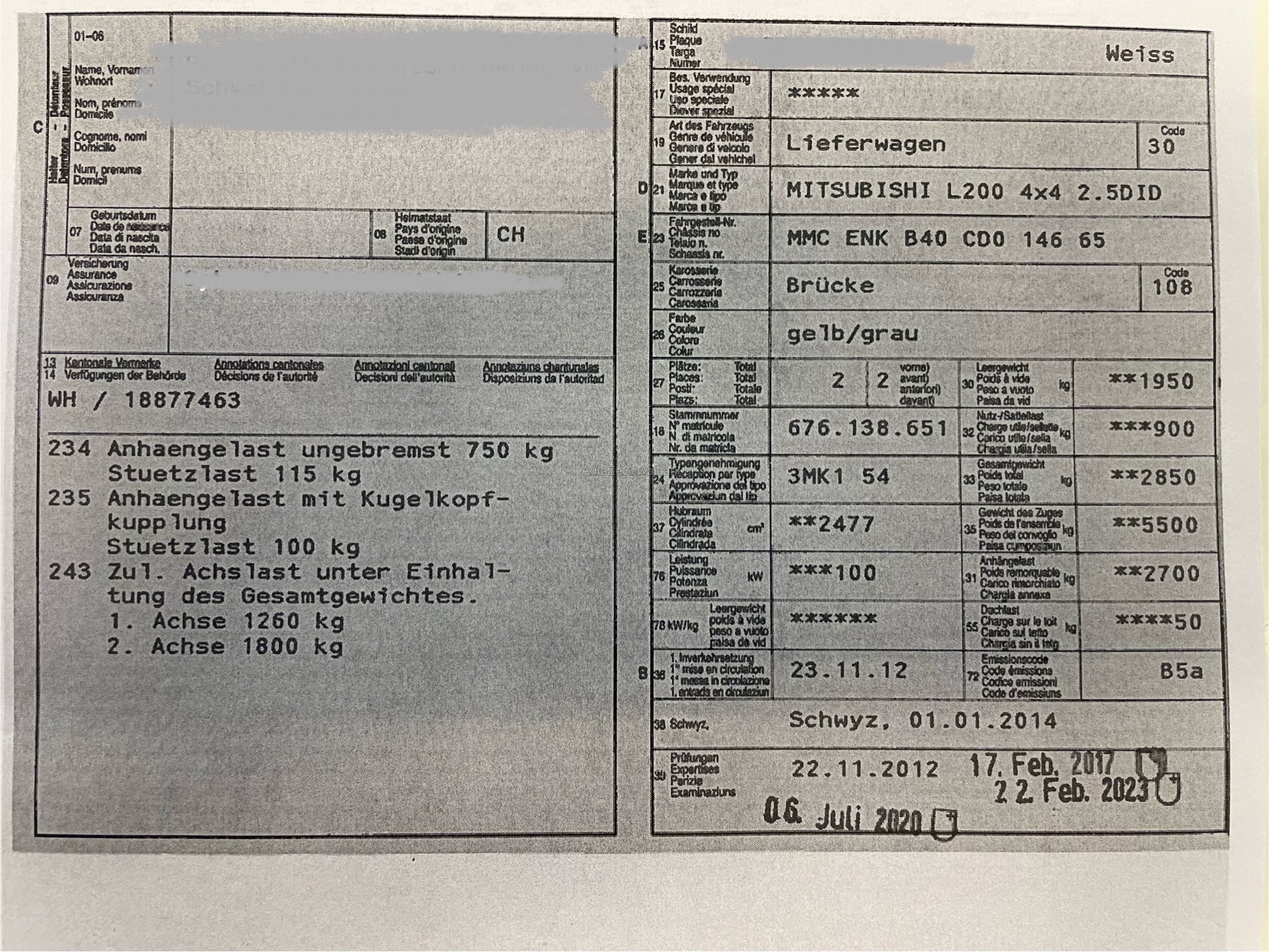 | Kommentar | - Scheinwerfer blind - Chassis stark angerostet, aber nirgens durchgerostet - Dieseltank verrostet - Stossdämpfer hinten Rost - Oelverlust Motor (KW-Simmerring) - Oelverlust Verteilergetriebe vorne Welle - Oelverlust Lenkung - Techn. Mängel im Ausweis, da 4 Mt.- Verlängerung für MFK |