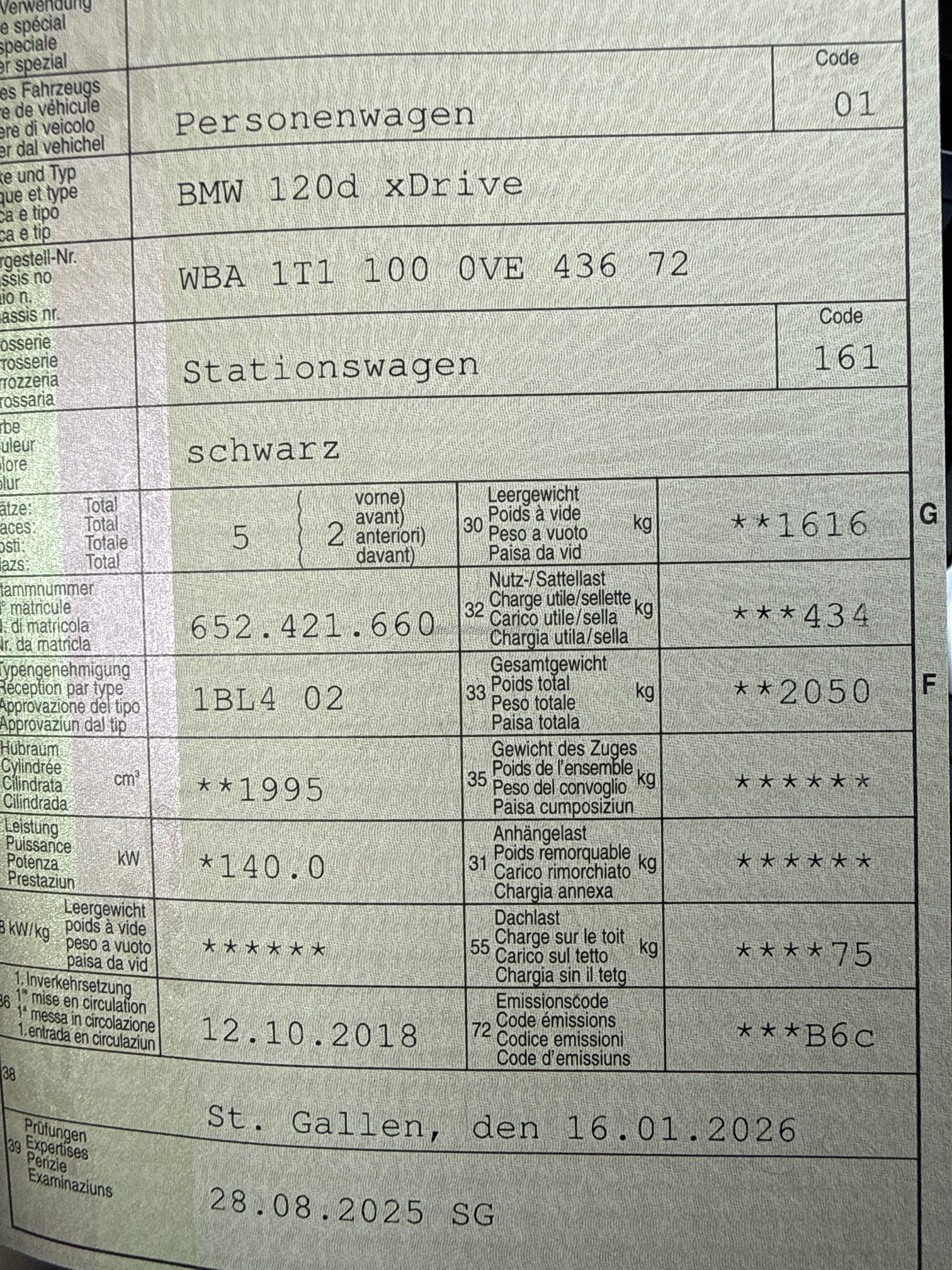| Kommentar | Fahrzeug in Betrieb und wird gefahren, keine Probleme bekannt, Parkschaden rechte Seite ( siehe Foto ) Cat Code Bezeichung Preise inkl. MwSt. 7.7% M 1T11 120d xDrive 44700.00 P 0475 BLACK SAPPHIRE METALLIC 990.00 F LCRY LEDER DAKOTA/COGNAC/AKZENT BRAUN(SW 2310.00 S 0164 ABGASTECHNIK EU6 0.00 S 01CA SELEKTION COP RELEVANTER FAHRZEUGE 0.00 S 020W 18"M LMR.DO.SPEI. 719 M BI.JET. 250.00 S 0216 SERVOTRONIC 0.00 S 0230 EU SPEZIFISCHE ZUSATZUMFAENGE 0.00 S 0249 MULTIFUNKTION FUER LENKRAD 0.00 S 0258 BEREIFUNG MIT NOTLAUFEIGENSCHAFTEN 0.00 S 02PA RADSCHRAUBENSICHERUNG 0.00 S 02TB SPORT-AUTOMATIK GETRIEBE 190.00 S 02VB REIFENDRUCKANZEIGE 0.00 S 0302 ALARMANLAGE 0.00 S 0322 KOMFORTZUGANG 370.00 S 03AG RUECKFAHRKAMERA 510.00 S 0413 GEPAECKRAUMTRENNETZ 240.00 S 0423 FUSSMATTEN IN VELOURS 0.00 S 0428 WARNDREIECK 0.00 S 0430 INNEN- UND AUSSENSPIEGELPAKET 620.00 S 0431 INNENSPIEGEL,AUTOMATISCH ABBLENDEND 210.00 S 0459 SITZVERSTELLUNG, ELEKTR.MIT MEMORY 1210.00 S 0465 DURCHLADESYSTEM 250.00 S 0481 SPORTSITZE FUER FAHRER/BEIFAHRER 0.00 S 0488 LORDOSENSTUETZE FAHRER/BEIFAHRER 290.00 S 0493 ABLAGENPAKET 0.00 S 0494 SITZHEIZUNG FUER FAHRER/BEIFAHRER 0.00 S 04AE ARMAUFLAGE VORNE VERSCHIEBBAR 0.00 S 04LU INT.L.SCHW.HOCHGL.M.AKZENT.L.PERLGL 0.00 S 0508 PARK DISTANCE CONTROL (PDC) 250.00 S 0521 REGENSENSOR 0.00 S 0534 KLIMAAUTOMATIK 700.00 S 0544 GESCHWINDIGKEITSREGEL. MIT BREMSF. 0.00 S 0548 KILOMETERTACHO 0.00 S 0552 ADAPTIVER LED-SCHEINWERFER 620.00 S 0563 LICHTPAKET 0.00 S 05A1 LED-NEBELSCHEINWERFER 0.00 S 05AC FERNLICHTASSISTENT 170.00 S 05DA BEIFAHRERAIRBAG-DEAKTIVIERUNG 0.00 S 05DC FONDKOPFSTUETZEN KLAPPBAR 0.00 S 05DP PARKASSISTENT 190.00 S 0609 NAVIGATIONSSYSTEM PROFESSIONAL 2600.00 S 0654 DAB TUNER 0.00 S 0676 HIFI LAUTSPRECHERSYSTEM 370.00 S 0698 AREA-CODE 2 0.00 S 06AC INTELLIGENTER NOTRUF 0.00 S 06AE TELESERVICES 0.00 S 06AK CONNECTEDDRIVE SERVICES 0.00 S 06AM REAL TIME TRAFFIC INFORMATION 200.00 S 06AN CONCIERGE SERVICES 320.00 S 06AP REMOTE SERVICES 0.00 S 06NW TELEFONIE MIT WIRELESS CHARGING 510.00 S 06UH TRAFFIC INFORMATION 0.00 S 06WA INSTRUMENTENKOMBI. M. ERW. UMF. 190.00 S 06WD WLAN HOTSPOT 0.00 S 0710 M LEDERLENKRAD 0.00 S 0715 M AERODYNAMIKPAKET 0.00 S 0760 M HOCHGLANZ SHADOW LINE 0.00 S 0775 M DACHHIMMEL ANTHRAZIT 0.00 S 07B3 EDITION M SPORT 5140.00 S 0851 SPRACHVERSION DEUTSCH 0.00 S 0879 DEUTSCH / BORDLITERATUR 0.00 S 08KA OELWARTUNGSINT. 30.000KM/24MONATE 0.00 S 08R9 KAELTEMITTEL 0.00 S 09AA AUSSENHAUTSCHUTZ 0.00 Total Sonderausstattung 18700.00 Total Neupreis 63400.00 |