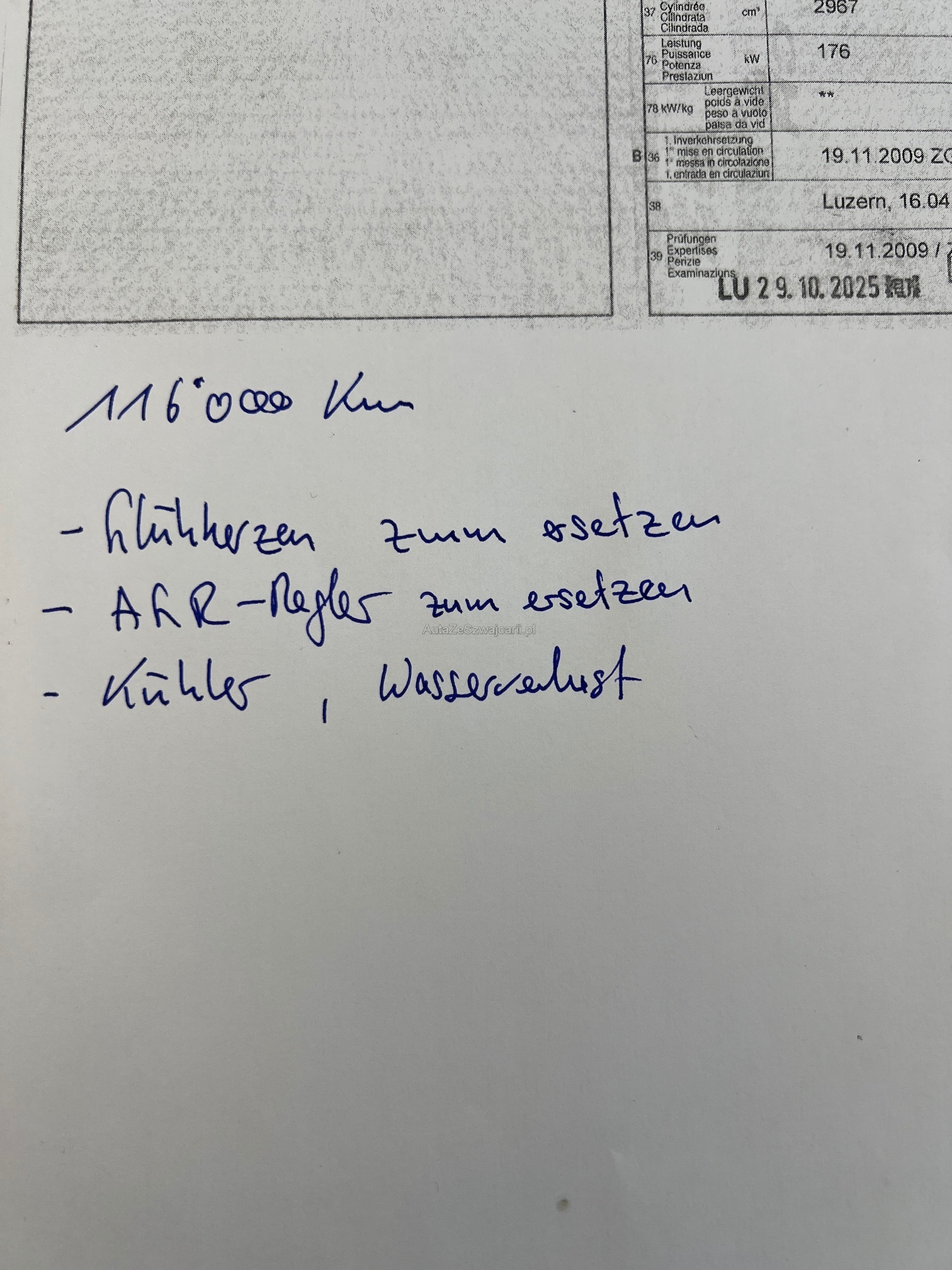 | Kommentar | Durch unsere Werkstatt wurde keine Diagnose gemacht und technisch nicht angeschaut. Nur vom Verkaufsteam für die Fotos. Fahrzeug wurde durch den Pannendienst zu Porsche Rotkreuz geliefert: Kunde von uns und nicht Porsche Rotkreuz. Gemäss Diagnose bzgl. dem Pannendienst durch Porsche Zentrum Rotkreuz: >Kühlwasser Verlust (Hat ein Leck) + Kühler muss ersetzt werden >Fehlermeldung AGR-Regler (ob das definitiv ersetzt werden muss, unklar) >Fehlermeldung Glühkerzen zum ersetzen (ob das definitiv ersetzt werden muss, unklar) >2te Schlüssel ob vorhanden, muss mit dem Kunden noch besprochen werden? sollte sicher vorhanden sein. >Fahrzeugmappe ob vorhanden, muss mit dem Kunden noch besprochen werden? War nicht im Fz. drin. sicherlich beim Kunden noch zu Hause. >Aktuell sind die Winterräder montiert und besitzt noch gebrauchte Sommerfelgen ohne Reifen, da die Reifen abgelaufen sind. Alle Aussen und Innenschäden gemäss Fotos vom 21.04.2026. Das Fahrzeug kann jederzeit in unserem Occasions-Center besichtigt werden (HORWERSTRASSE 120, 6010 KRIENS) Der Kunde hat schon ein Fahrzeug bei uns gekauft und möchte den best möglichen Preis gemäss Gebote. Hat keine genaue Preisvorstellungen und wir warten auf die Gebote von Best Car Price. Für weitere Fragen stehe ich Euch gerne jederzeit zur Verfügung: / gjergj.bullakaj@carplanet.ch |