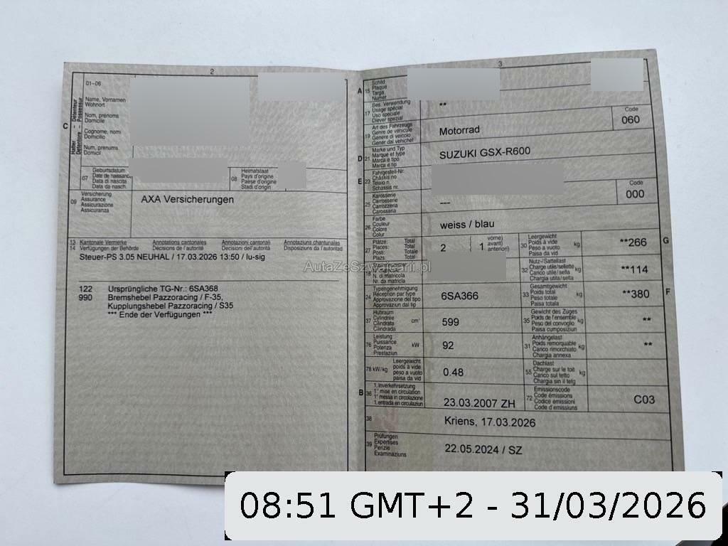 | Fahrzeugausweis | Vorhanden |