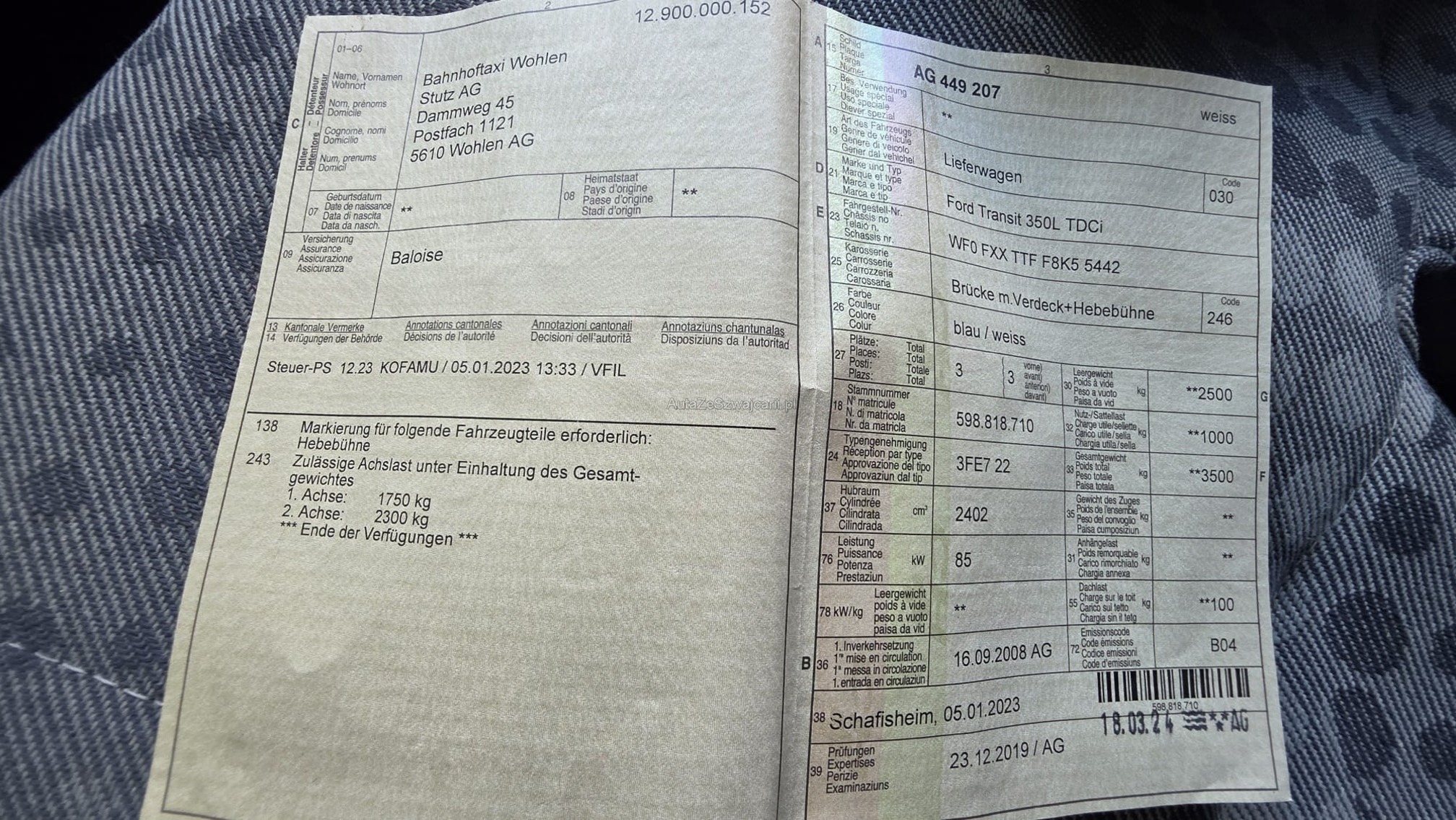 | Kommentar | Mängel: - Kratzer und Dellen am Auto (siehe Fotos) Das Risiko liegt vollständig beim Käufer. Um Missverständnisse zu vermeiden, kann das Fahrzeug nach vorheriger Anmeldung besichtigt und getestet werden. Wird bewusst darauf verzichtet, liegt die Verantwortung beim Käufer. Nach dem Zuschlag sind keine Nachverhandlungen mehr möglich. Das Fahrzeug wird ab Platz verkauft, ohne Garantie. Wandelung und Minderung sind ausgeschlossen. Die Abholung des Fahrzeugs hat spätestens innerhalb von 5 Arbeitstagen nach dem Zuschlag zu erfolgen. Spätere Abholungen können nach Absprache vereinbart werden, werden jedoch mit CHF 8.– pro Tag in Rechnung gestellt. |