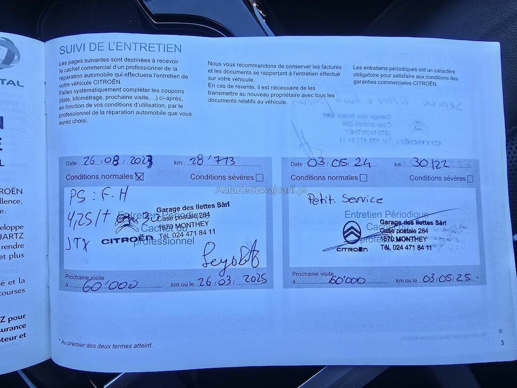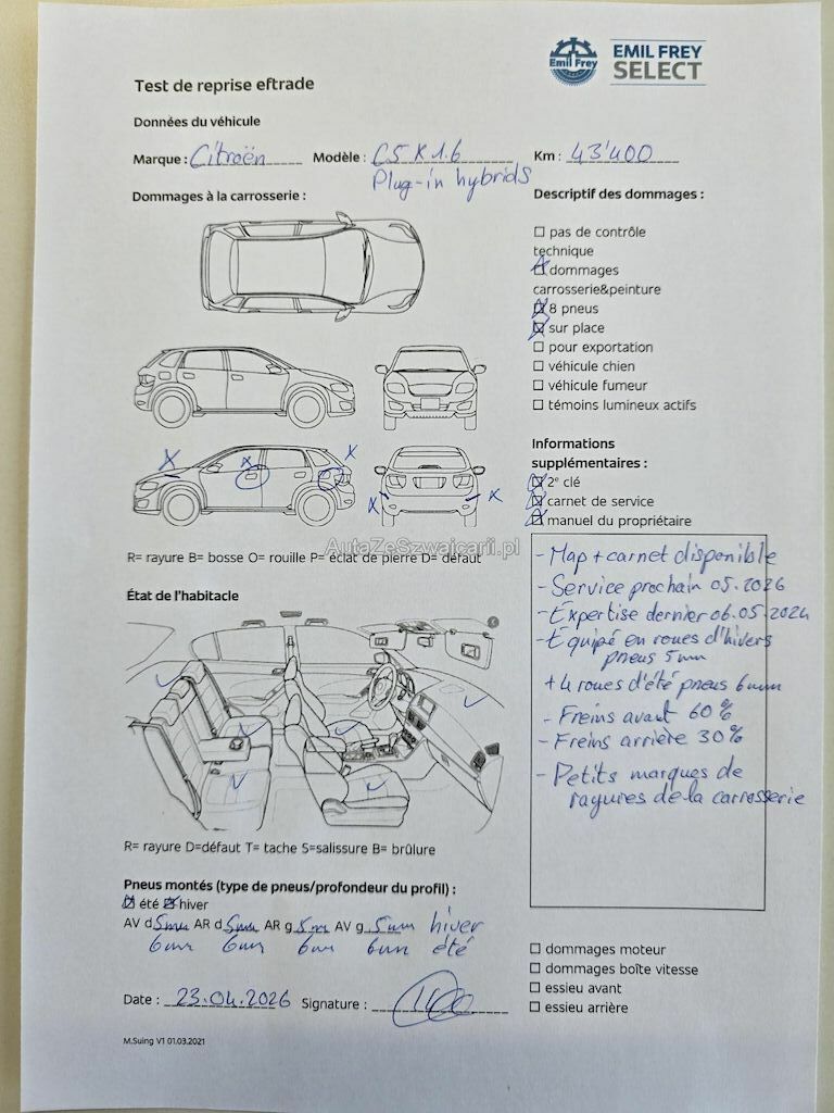 | Information | 2 clés Map + carnet de service disponible Service prochain 05.2026 Expertise dernier 06.05.2024 Equipé en roues d'hiver pneus 5 mm + 4 roues d'été pneus 6 mm Freins avant 60% Freins arriè 30 % Petits marques de rayures sur la carrosserie Pas de contrôle technique (essai en aroute) effectué 2 keys MOT certificate and service history available Next service due 05/2026 Last MFK 06.05.2024 Fitted with winter tyres 5 mm + 4 summer tyres 6 mm Front brakes 60% Rear brakes 30 % Minor scratches on the bodywork No workshop inspection (road test only) carried out |