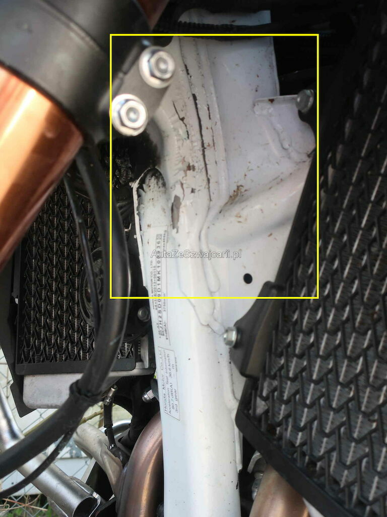 Roue avant, disque de frein, fourche avant, guidon, poignée, protège poignée, rétroviseur le tout à gauche, réservoir rayé, ponts de fourche, cadre, radiateur gauche, tête de fourche, carénage gauche.