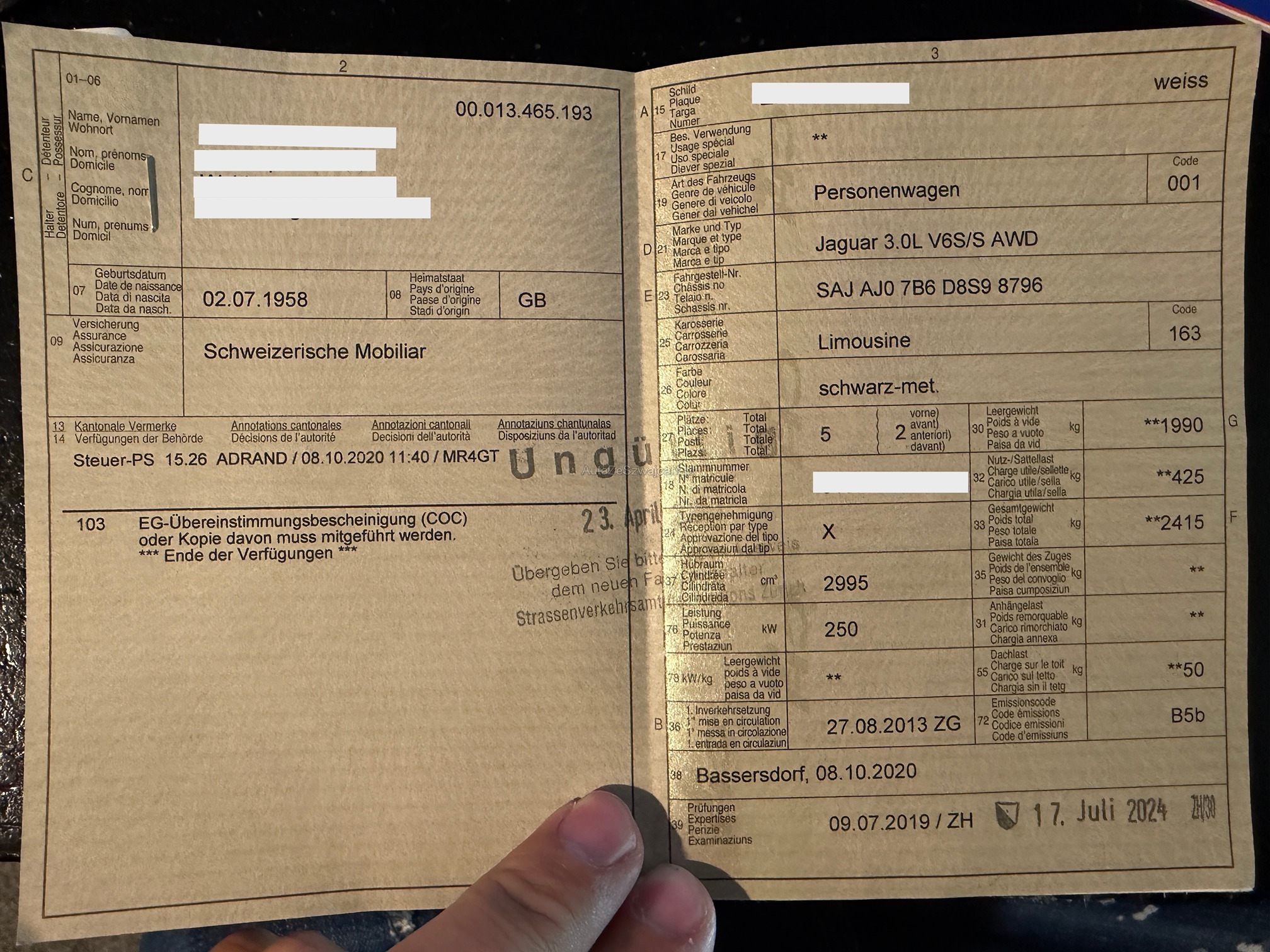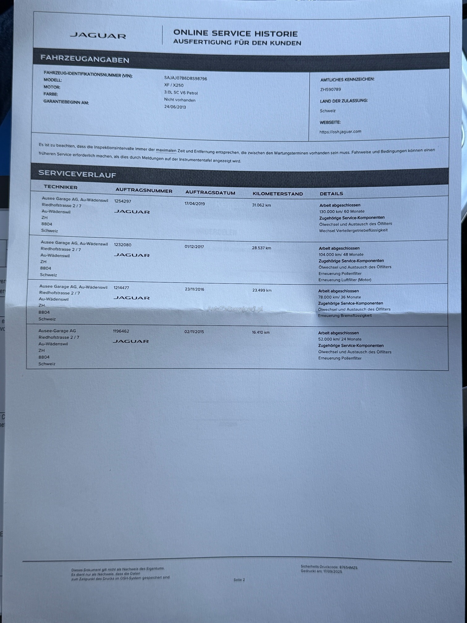 | Kommentar | Fahrzeug fährt sich einwandfrei, es leuchten keinerlei Warnlampen oder sonstiges. Fahrzeug von älterem Herrn gefahren und immer sauber gewartet bei Jaguar. Mängel: 4 Felgen leicht verkratzt Dach hinterer Teil ca. 10 kleinere Dellen siehe Bilder Rest sauber. Beifahrertüre hinten leicht verkratzt siehe Bilder Fahrzeug ist bereits eingetauscht und wird nur abgegeben werden wenn wir einen Mindestreis von Fr. 6`000.- und mehr erzielen. Fahrzeug muss innert 3 Arbeitstagen Abgeholt werden. |