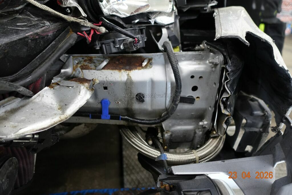 Die komplette Fahrzeugfront VR ist eingedrückt. Der Querlenker VR weist ebenfalls eine Deformation aus.