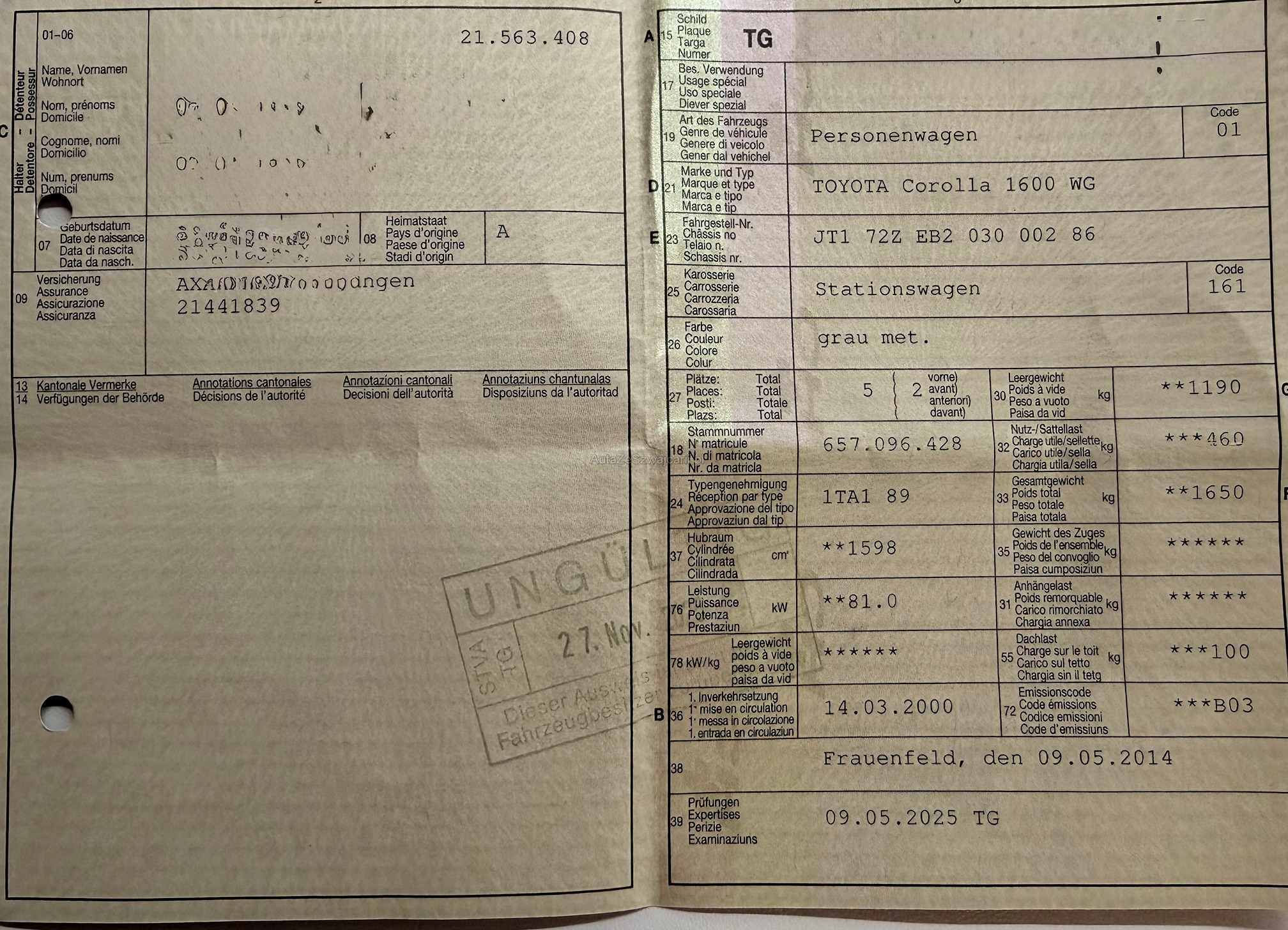 | Kommentar | Fahrzeug aus 1. Hand, kein Rauch und keine Tiere. Gebrauchspuren siehe Bilder. Ab Platz ohne Garantie oder Gewährleistung, Wandelung und Minderung werden wegbedungen. Der Verkauf erfolgt ab Platz, ohne Garantie, ohne Gewährleistung und ohne Rücknahme. Das Fahrzeug wurde technisch nicht weiter geprüft. |