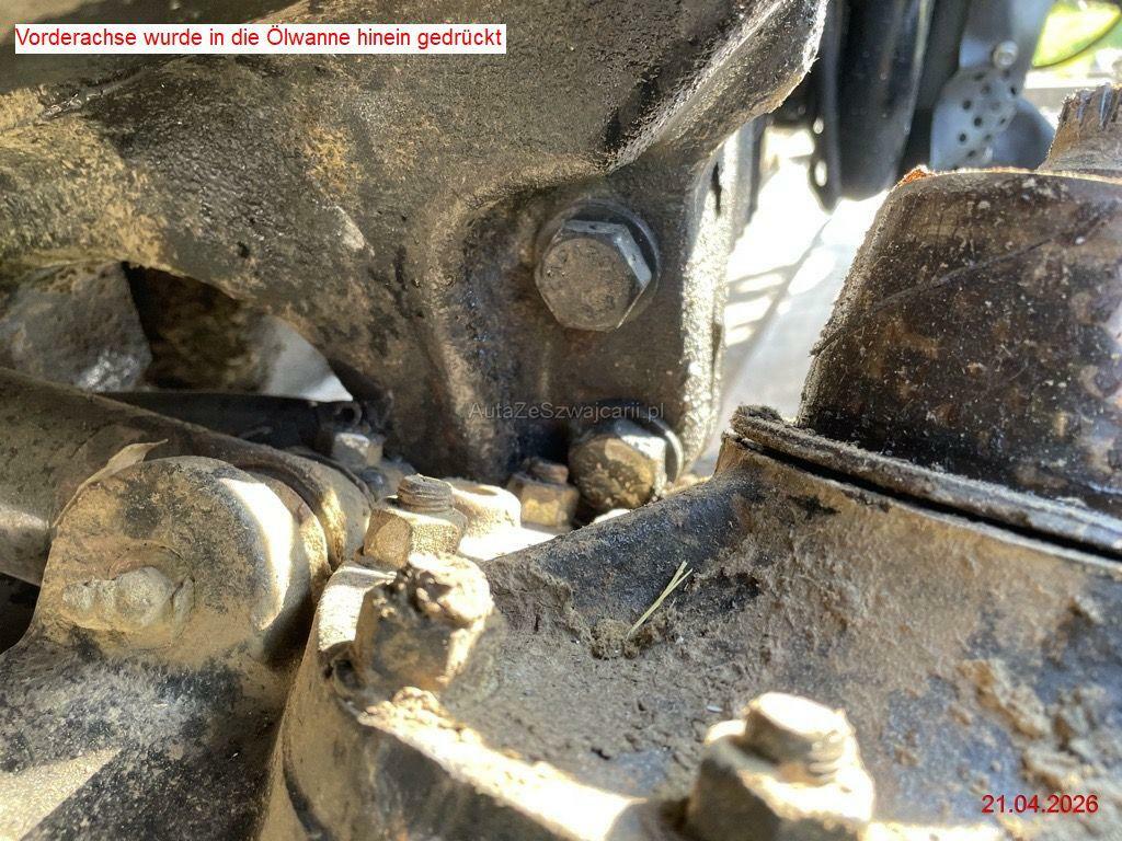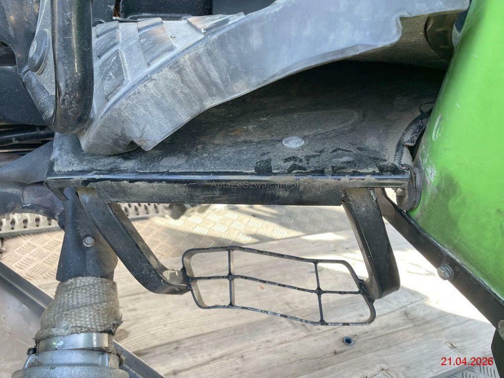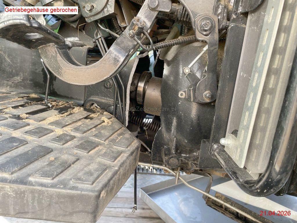 | Schadensbeschreibung | Beschreibung der Schäden: Vorderachse abgerissen und Aufnahme abgebrochen, div. Leitungen abgerissen, Getriebegehäuse gebrochen, Auspuff beschädigt, beide Felgen vo. beschädigt, Kotflügel v.l beschädigt, Kotflügel h.l beschädigt, Boden v.l verformt, div, Verkleidungen gebrochen Motor läuft nicht (Zustand unbekannt), Stundenzähler kann nicht mehr abgelesen werden, ca. 1'100 h vom Fz-Halter angegeben (Kabelstrang/Sicherungskasten beschädigt) Die spezielle Aufnahme am Auspuff für einen Auspuffschlauch wird vermutlich demontiert werden. |