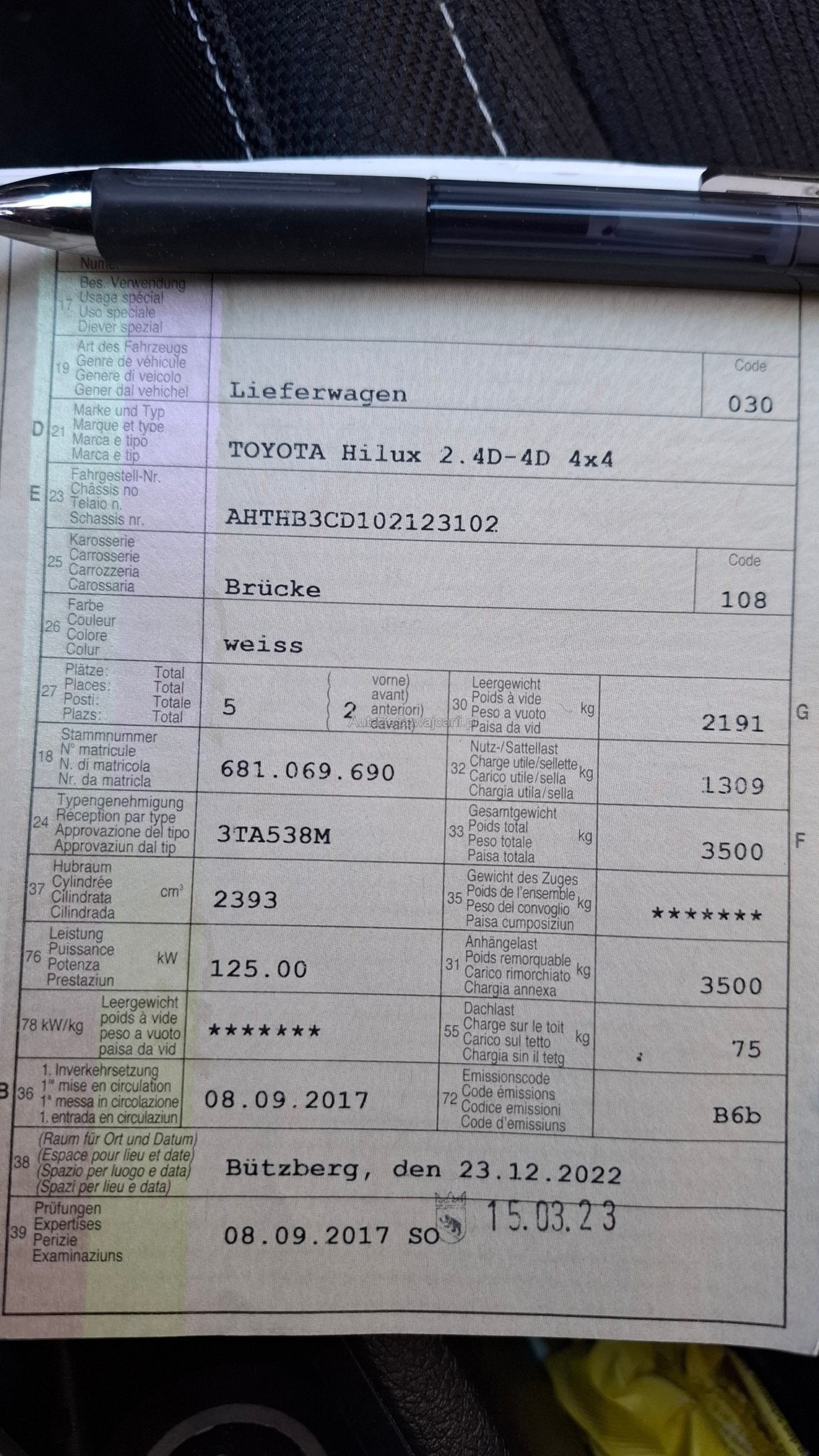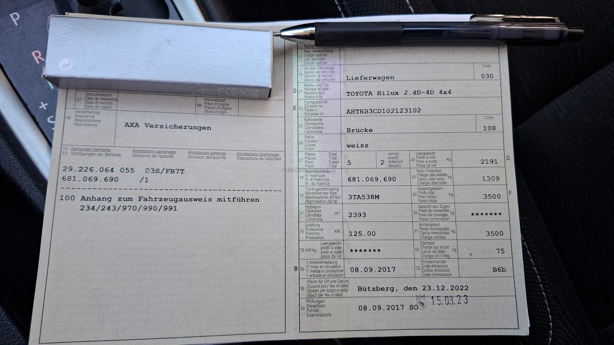 | Kommentar | Fährt und Schaltet einwandfrei Starterbatterie sollte ersetzt werden Werkzeuge sind nicht im Kaufpreis inbegriffen.! Zusätzliche Federbälge auf der Hinterachse mit DTC Geprüft Arbeitsfahrzeug Frontscheibe wird noch ersetzt Für sichtbare oder nicht sichtbare Mängel wird nicht gehaftet. Wir testen & kontrollieren nicht alle Funktionen vom Fahrzeug. Das Risiko liegt somit vollumfänglich beim Käufer. Nachdem der Höchstbietende den Zuschlag erhalten hat, gibt es keine Nachverhandlung, auch wenn nicht deklarierte Mängel zum Vorschein kommen sollten. Fahrzeug wird ab Platz verkauft ohne Garantie und ohne jegliche Nachwährschaft. Wandelung und Minderung werden wegbedungen. Es Gelten Unsere AGBS |