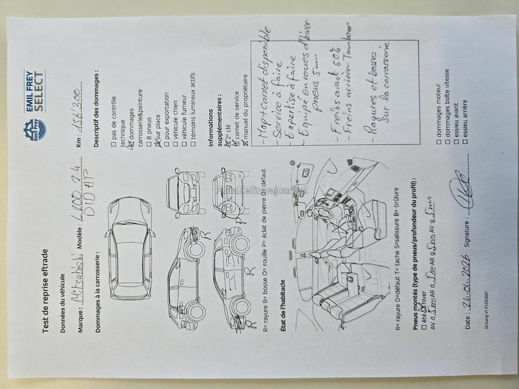 | Information | 2 clés Map + carnet de service disponible Service à faire Expertise à faire Equipé en roues d'hiver pneus 5 mm Freins avant 50% Freins arrière - Tambour Rayures et bosses sur la carrosserie Rayures et bosses sur la carrosserie Pas de contrôle technique (essai en route) effectué Pas de contrôle FAP/DPF |