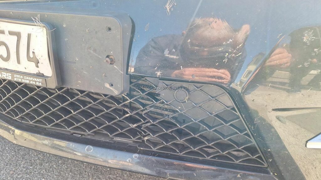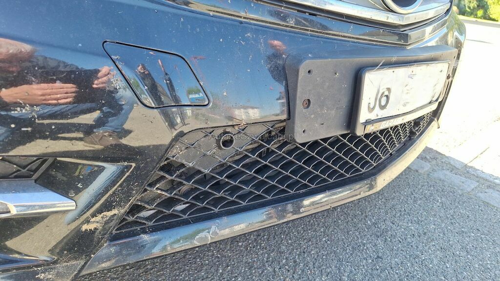 Avant, collision avec un animal: Pare-chocs déformé et fendu, grilles inférieure centrale et gauche, Grille de calandre cassée, capteurs d'aide au parcage, phare avant gauche, capot moteur déformé, face frontale reculée, intercooler endommagé.