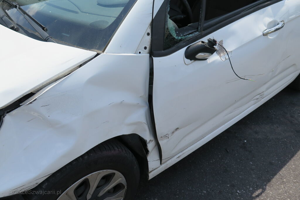 Pare-chocs avant endommagé, aile avant gauche enfoncée, capot moteur endommagé, portes avant et arrière rayées et enfoncées, rétroviseur arraché, vitre cassée, éclats de verre dans l'habitacle, aile arrière gauche rayée et enfoncée, chapeaux de roues cassés, divers garnissages et accessoires cassés.