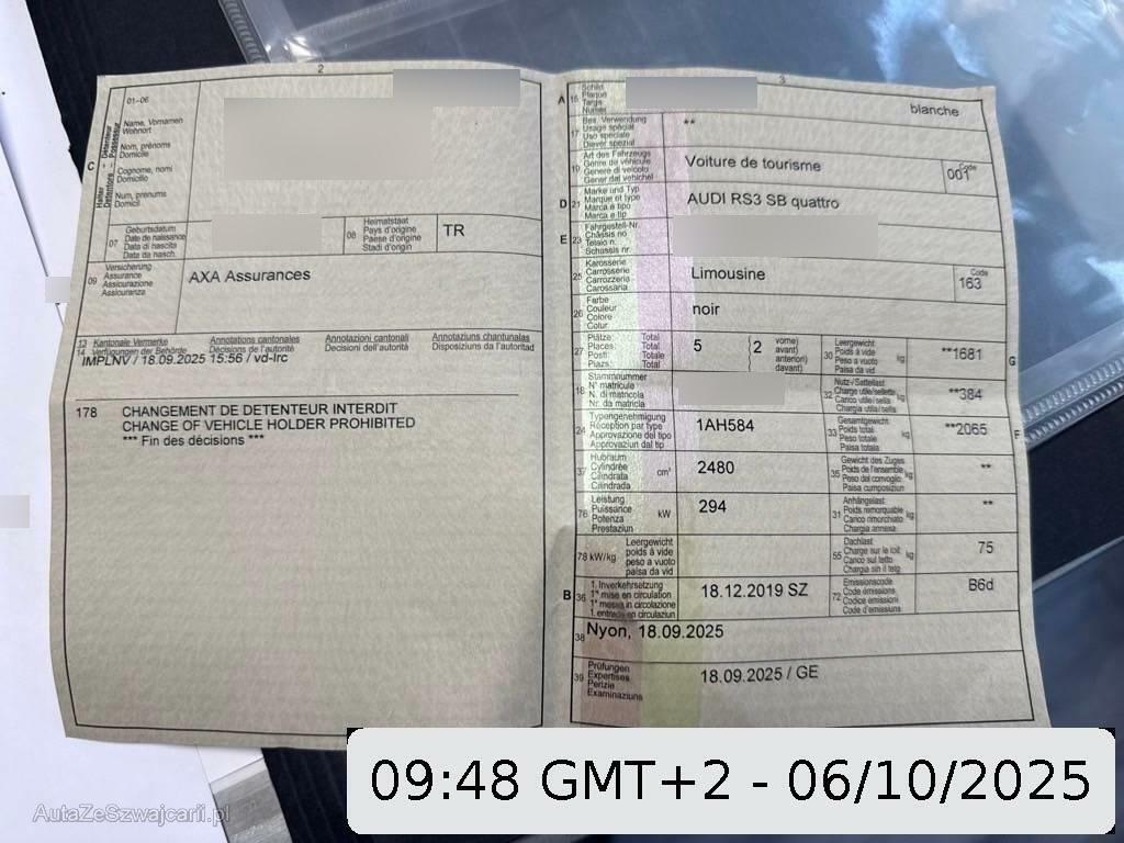 Sonderausstattung | Assistenzpaket (Licht: Fernlicht-Assistent, Audi pre sense front, Assist: Verkehrszeichenerkennung, Assist: Einparkhilfe plus, Assist: Audi active lane assist), Komfortschlüssel inkl. Diebstahlwarnanlage, Assistenzpaket ohne Audi side assist, S Sportsitze, Rücksitzbank ungeteilt,Lehne geteilt umlegbar (dreiteilig) mit Mittelarmlehne, RS-Sportauspuffanlage, Aussenspiegel in Wagenfarbe, Assist: Anfahrassistent, Media: Bang & Olufsen Soundsystem, Navigationssystem plus mit MMI, Volllederausstattung Feinnappa mit Rautensteppung, Optikpaket schwarz glänzend, erweitert mit Audi Ringen, Audi virtual cockpit 12,3'', Panorama-Glasdach, Garantie: Audi Garantie: 5 Jahre oder 100'000 km (ab 1. Inv.), Audi connect (3 Jahre), Alu-Räder 5-Arm-Design 8,5Jx19 vorne, 8Jx19 hinten, Titanoptik matt, Matrix LED Scheinwerfer, Assist: Rückfahrkamera, Abgedunkelte Seiten- und Heckscheibe |