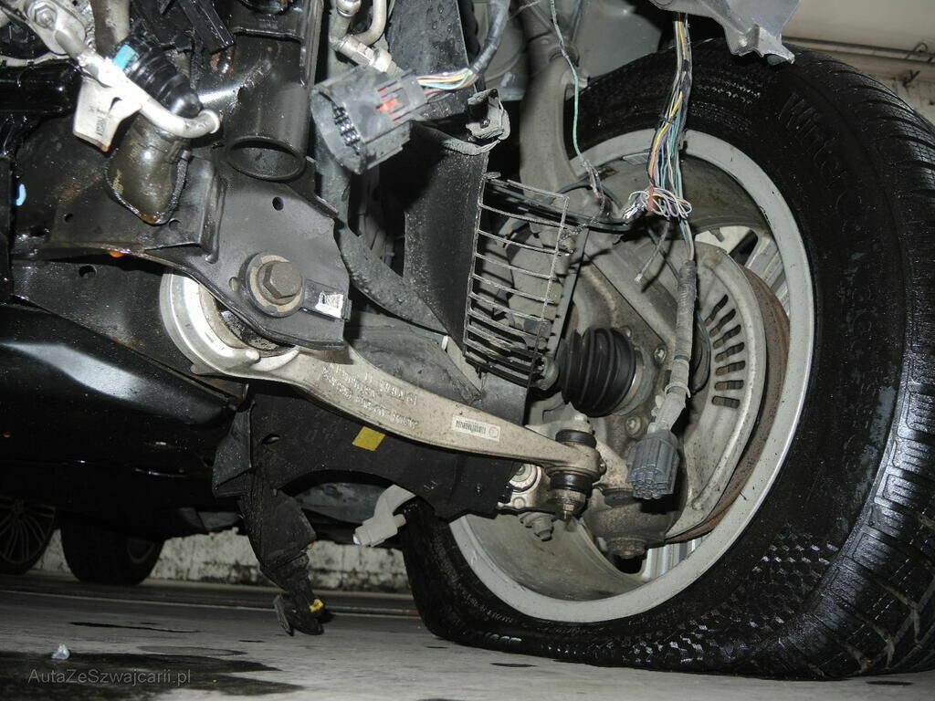 Front massiv deformiert und eingestaucht, Frontstruktur deformiert, beide Längsträger verzogen, Kühlerpaket in Motor geschoben, Radaufhängung vorne links verschoben, Achsträger deformiert, Frontairbags ausgelöst