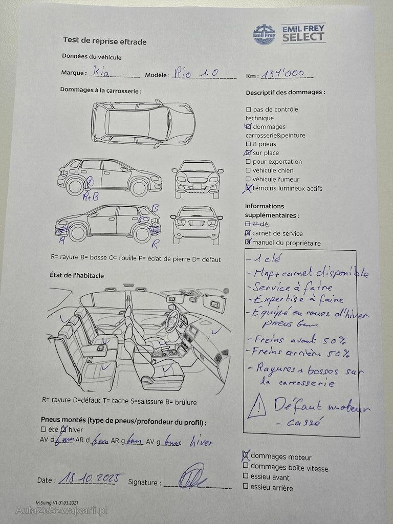 Information | 1 clé Map + carnet de service disponible Service à faire Expertise à faire Equipé en roues d'hiver penus 6 mm Freins avant 50% Freins arrière 50 % Rayures et bosses sur la carrosserie Défaut moteur - casser |