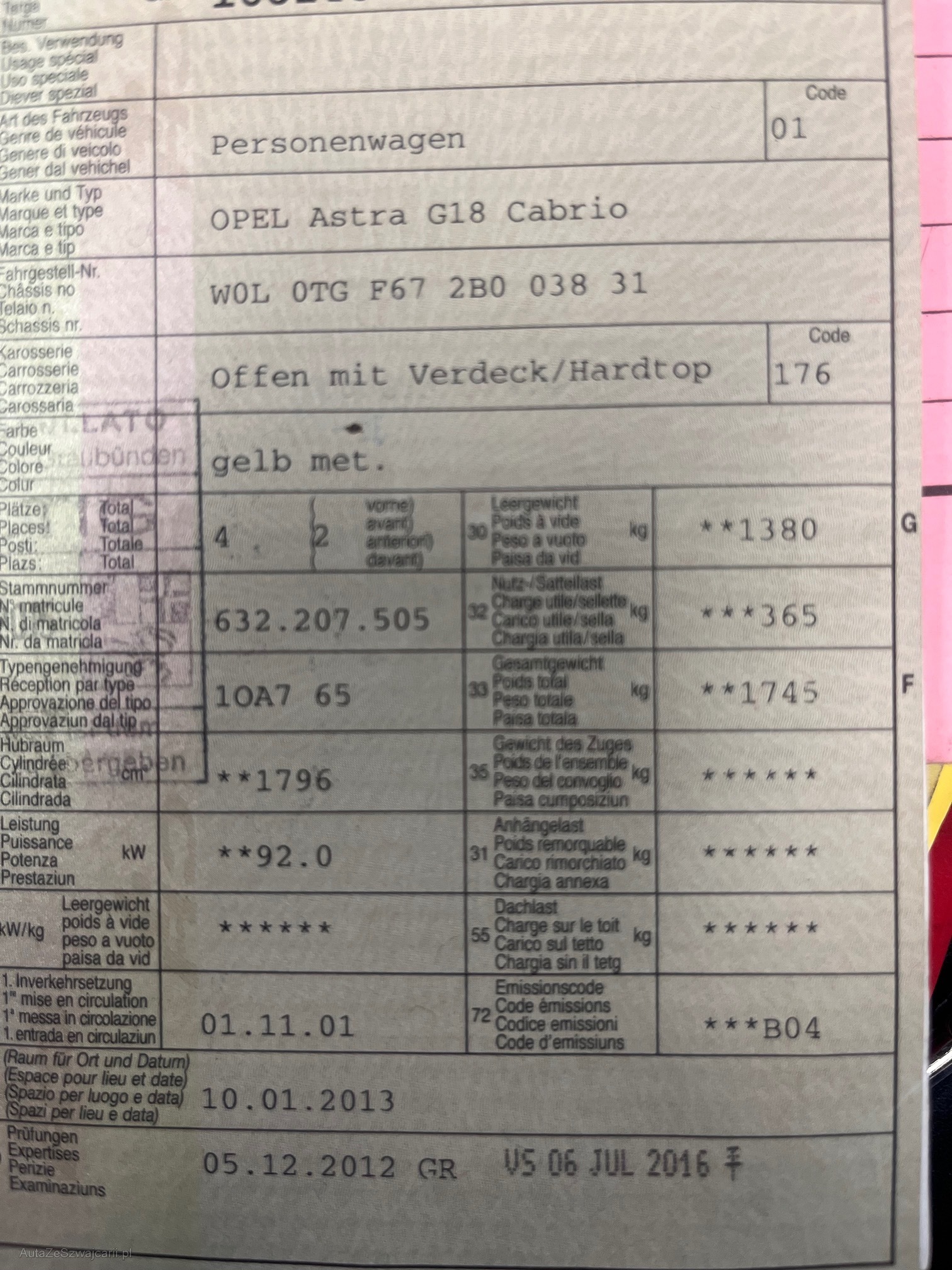 | Kommentar | Es handelt sich um ein Occasion Fahrzeug das Gebrauchsspuren aufweist. Carrosserieschäden am Fahrzeug/Scheinwerfer siehe Fotos. Motor / Getriebe i.o. Verdeck/Dach kann einwandfrei elektrisch geöffnet und geschlossen werden. Es wude kein detaillierter Werkstatttest am Fahrzeug gemacht. Reifenprofile sind sehr gut haben aber ältere DOT. Jede Gewährleistung, soweit nach Gesetz möglich, wird wegbedungen, insbesondere sind Wandelung und Minderung ausgeschlossen. Der Käufer bestätigt mit seinem Gebot, dies anzuerkennen und verpflichtet sich, das ersteigerte Fahrzeug umgehend nach einer Banküberweisung abzuholen. Der Preis ist fix und nicht mehr verhandelbar! Es wird grundsätzlich kein Werkstatttest durchgeführt. |