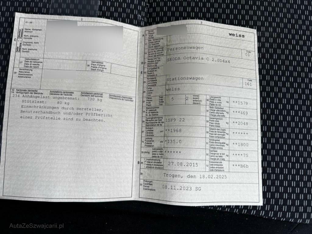 | Sonderausstattung | Elektrische Fensterheber vorne + hinten, Innenspiegel automatisch abblendbar, Assist: Rückfahrkamera, Dunkel getönte Scheiben (SunSet), Licht: LED Heckleuchten, Reifendruckverlust-Warnsystem, Navigationssystem COLUMBUS, Maxi-DOT, Schliess- und Startsystem KESSY, Klimatisierungsautomatik Climatronic, Maxi-DOT Display farbig, Lackierung: Uni-Lackierung Laser weiss, Nebelscheinwerfer in schwarz, Sitze: Mittelarmlehne vorne inkl. grosser Jumbo-Box (kühlbares Ablagefach), Elektrische Heckklappe, Berganfahrhilfe (Hill Holder), Media: SmartLink, Sitze: Vordersitze heizbar, Anhängervorrichtung mit abnehmbarem Kugelkopf, Park Distance Control vorne und hinten, Lichtassistent inkl. Regensensor, Adaptives Fahrlicht inkl. Bi-Xenon-Scheinwerfer und Scheinwerferreinigungsanlage und LED Tagfahrlicht, Vorbereitung für Handy mit Sprachsteuerung und Bluetooth und WLAN, Zwischenboden im Kofferraum, Teppichfussmatten vorne und hinten, Netzpaket Kofferraum, Schlechtwegefahrwerk |