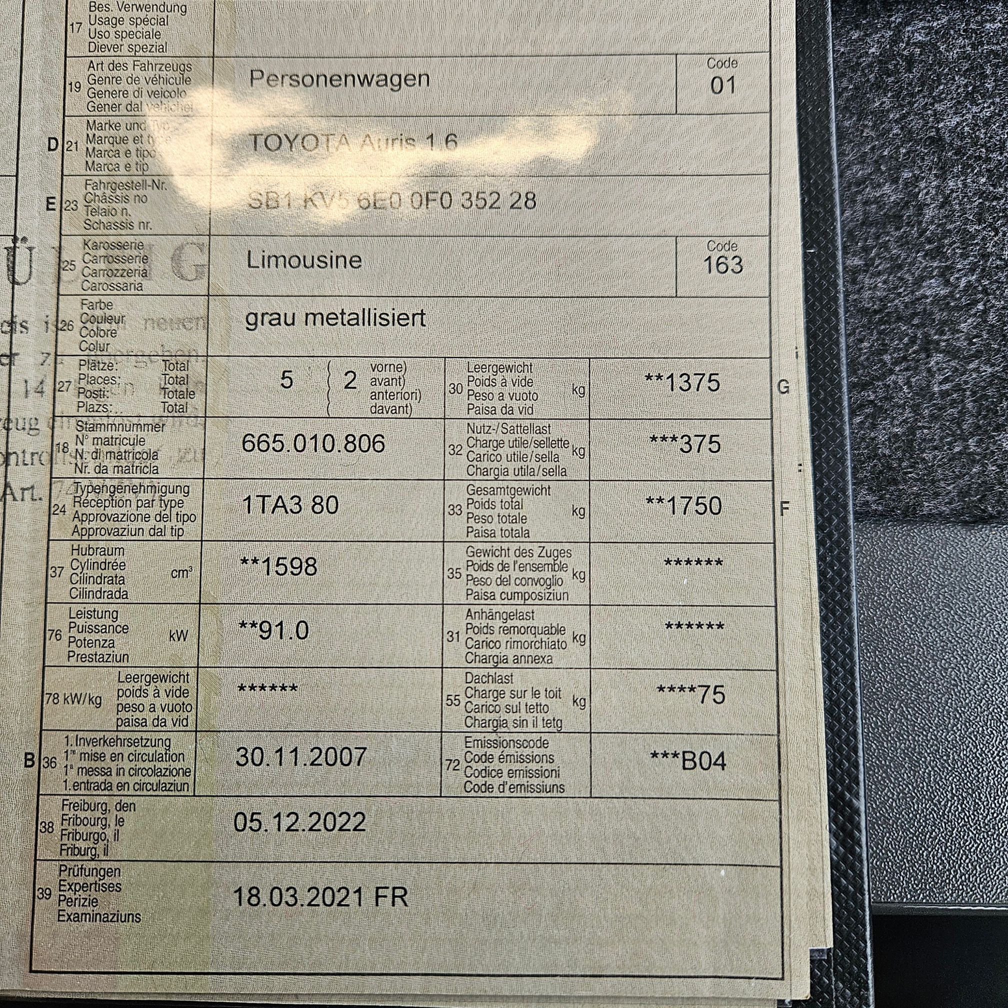 | Kommentar | Das Fahrzeug muss MFK bereit gestellt werden. Diverse Mängel bei Aufhängung und Bremsen. Carrosserie hat zum Teil leicht Dellen und Kratzer. Das Fahrzeug muss in 1717 St. Ursen abgeholt werden. Bei Zuschlag bitte unter der Telefonnummer od. unter verkauf@schlossmatt-garageag.ch Kontakt aufnehmen. Fahrzeug wurde kein Werkstatttest gemacht (Für sichtbare oder nicht sichtbare Mängel wird nicht gehaftet). Wir testen und prüfen nicht alle Funktionen des Fahrzeugs. Das Risiko liegt somit vollumfänglich beim Käufer. Nach Erhalt des Zuschlags, gibt es keine Nachverhandlung, auch wenn nicht deklarierte Mängel zum Vorschein kommen. Ab Platz ohne Garantie oder Gewährleistung, Wandelung und Minderung werden wegbedungen. |