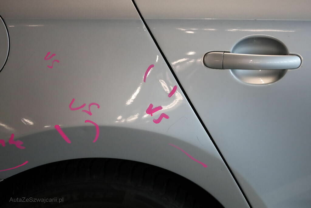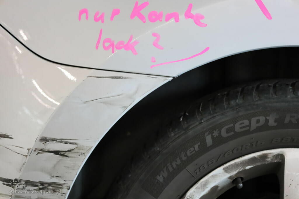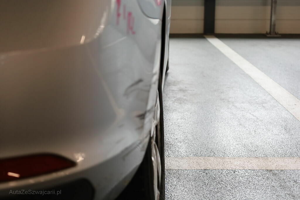 Anprall an die rechte Fahrzeugseite mit Deformation von Stossfänger, Hinterachsträger, Felge hinten sowie Seitenwand.