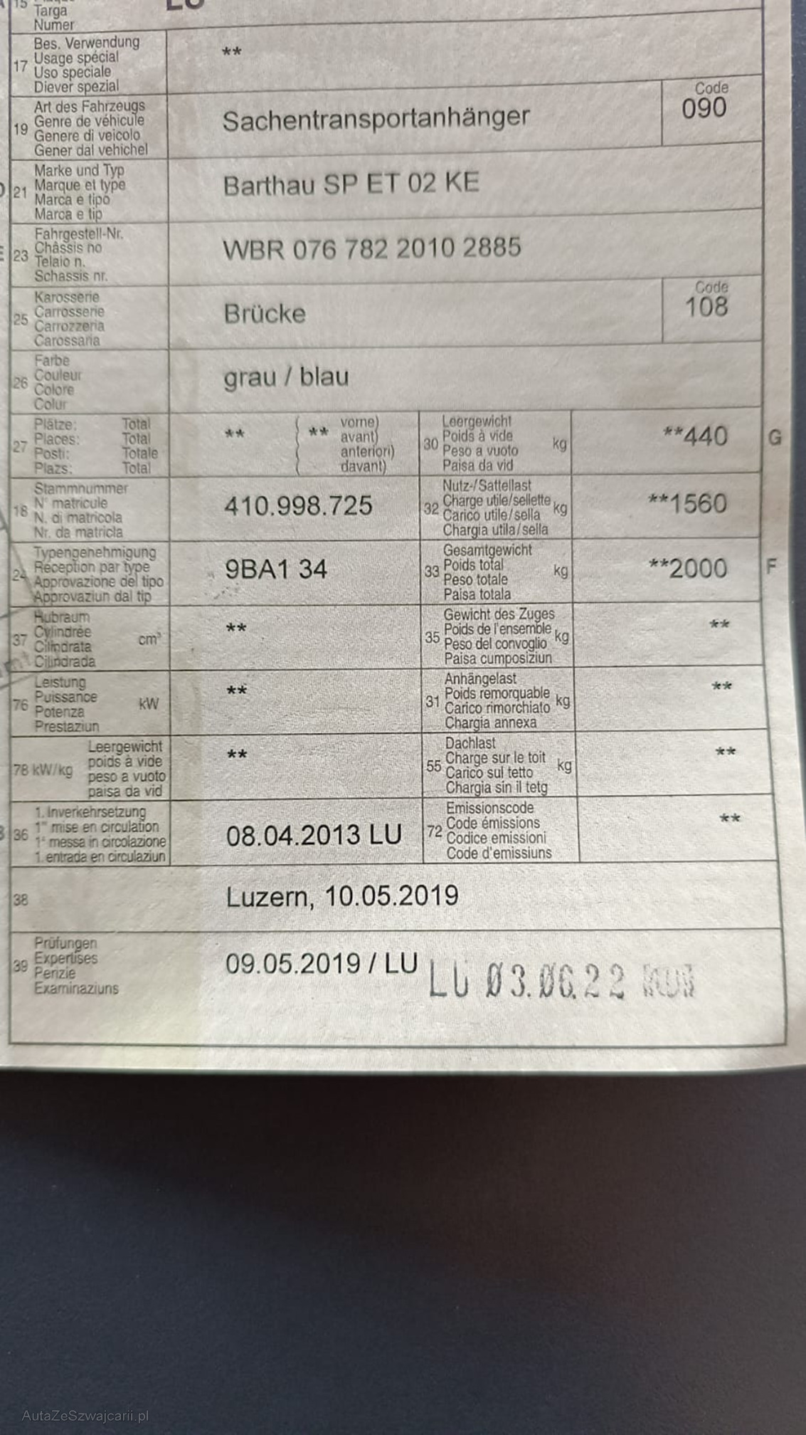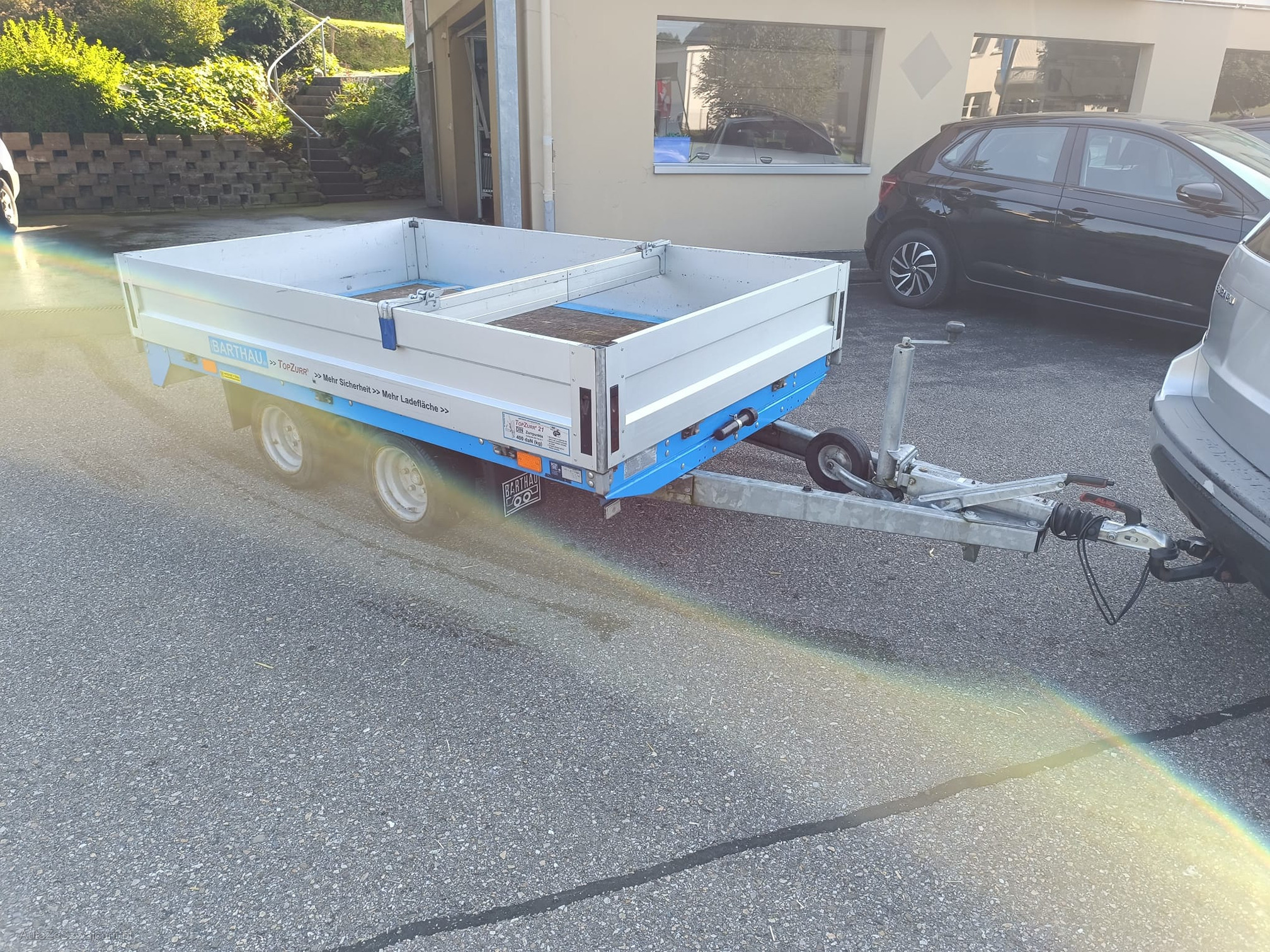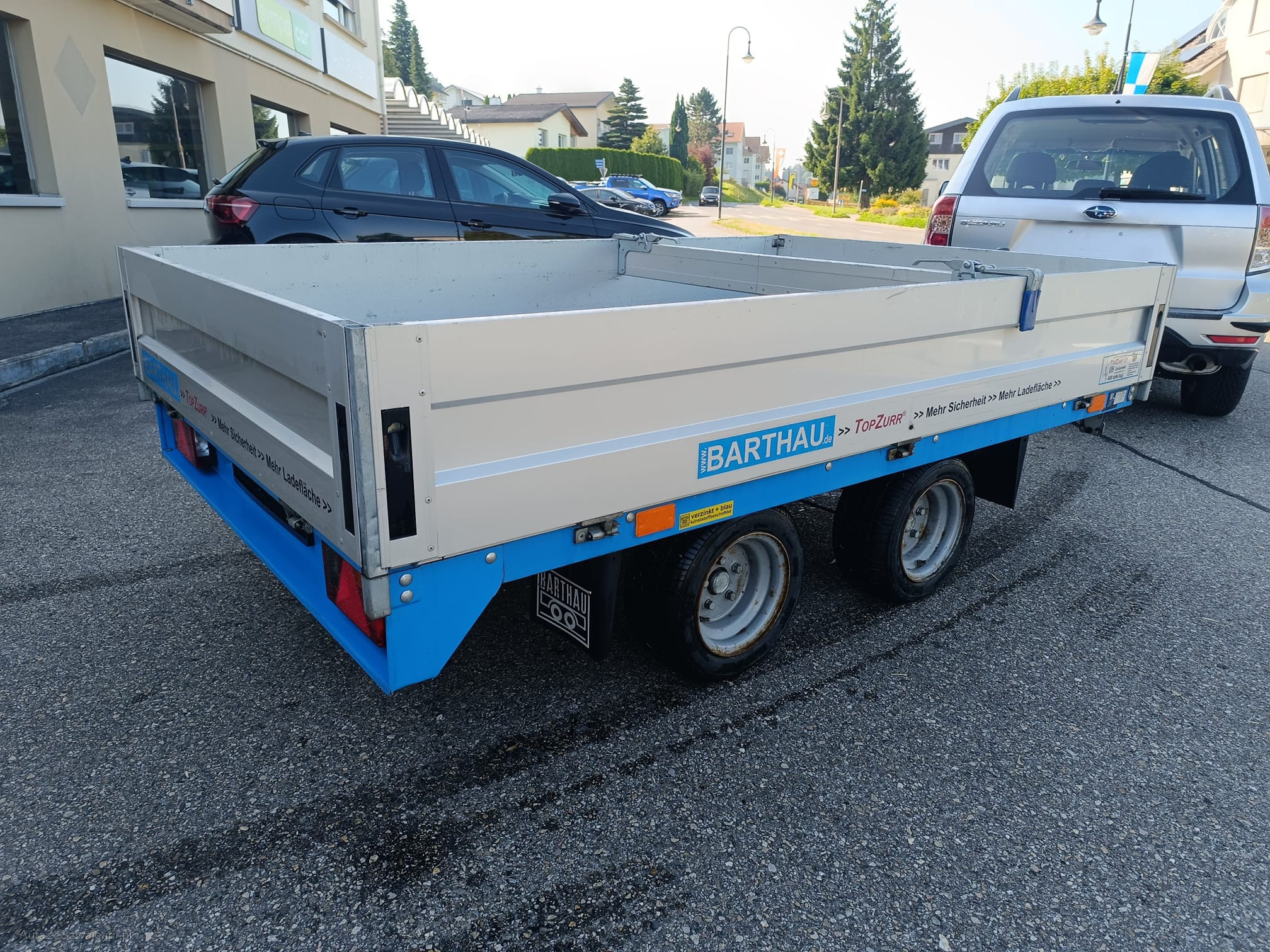| Kommentar | Barthau Anhänger. Dem Alterentsprechend Gebrauchsspuren. Sehr gepflegt und wenig gebraucht. Alles funktionstüchtig. Inkl. Zurrfix. Gesamtgewicht: 2000kg Nutzlast: 1560kg Leergewicht: 440kg Am Fahrzeug wurde keine vollumfängliche Prüfung der mechanischen Teile und der Carrosserie durchgeführt! Das Risiko liegt somit vollumfänglich beim Käufer. Um Missverständnisse zu vermeiden kann das Fahrzeug auf Voranmeldung besichtigt werden. Wird davon bewusst kein Gebrauch gemacht, liegt die Verantwortung beim Käufer. Nach Zuschlag, keine Nachverhandlungen möglich. Ab Platz ohne Garantie, Wandelung und Minderung werden wegbedungen. |