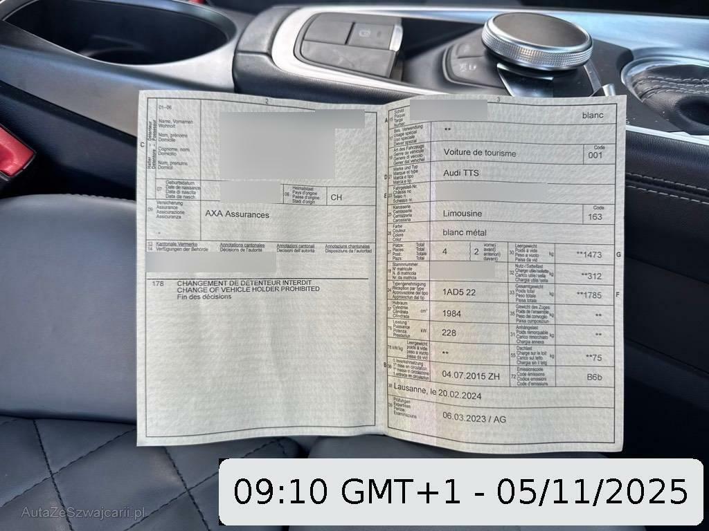 | Serienausstattung | Adaptives Bremslicht, Rücksitzlehne geteilt abklappbar, Elektrische Fensterheber vorne, Sequentielles 6-Gang-Getriebe mit Automatikfunktion, Audi active lane assist, Aussenspiegel Aluminium Optik, Getönte Scheiben, Licht: LED Scheinwerfer, Fahrwerk: Sportfahrwerk, Mittelarmlehne vorne verschiebbar, Beide Make up-Spiegel beleuchtet, Elektronisches Stabilitäts-Programm (ESP), Licht: Drittes Bremslicht, Katalysator geregelt, Einstiegsschienen, Seitenairbag für Fahrer und Beifahrer, 3-Punkt-Sicherheitsgurte auf allen Plätzen, Scheinwerfer-Waschanlage, Sitze: Vordersitze heizbar, Garantie: 2 Jahre ohne Kilometerbegrenzung (ab 1. Inv.), Diebstahlwarnanlage mit Innenraum- überwachung und Abschleppschutz, Lenkrad: Progressivlenkung, Lichtsensor, Mittelarmlehne vorn in Kunstleder schwarz mit Kontrastnaht in Rot, Tempomat, Innenraumbeleuchtung, Innenspiegel automatisch abblendbar, S Sportsitze vorne mit elektr. Lendenwirbelstütze, Parkbremse, elektromechanisch, Multifunktions-Sportlenkrad in Leder, unten abgeflacht Tiptronic, mit Schaltwippen, Sicherheitslenksäule, Seitenaufprall-Schutzsystem, Licht: Nebelschlussleuchte, Alcantara-/Leder-Ausstattung, Räder: Reifendruck-Kontrollanzeige, Interieurelemente Quarzlack, Fussstütze und Pedalkappen in Edelstahl, Tankdeckel-Entriegelung von innen, Aussentemperaturanzeige, Wärmeschutzverglasung, ISOFIX Kindersitzvorrichtung, LED Blinker im Aussenspiegel, Allradantrieb permanent, Alu-Räder im 10-Y-Speichen-Design 18J, Antiblockiersystem (ABS), Klima: Klimatisierungsautomatik, Aussenspiegel rechts und links beheizt, elektrisch verstell- / und einklappbar, Licht: LED Heckleuchten, Dekoreinlagen in Aluminium, Aschenbecher und Zigarettenanzünder, Modellbezeichnungen (Logo & Model), Assist: Bremsassistent (BAS), Heckscheibenheizung, Teppichfussmatten vorne, Media: 8 Lautsprecher, Scheibenwischer vorne mit Intervall, Airbag: Airbag Fahrer und Beifahrer, Raucherpaket, Antriebsschlupfregelung (ASR), MMI Radio, Servolenkung geschwindigkeitsabhängig, Regensensor für Scheibenwischer vorne, Audi magnetic ride, Klima: Pollenfilter (Staubfilter), Frontscheibe mit Color-Band, Bordcomputer, Media: Digitaler Radioempfang (DAB), Stopp-/Start-System, Räder: Reifenreparatur-Set (Tire Fit), Heckspoiler, geschwindigkeitsabhängig elektrisch ausfahrbar, Audi drive select, Elektronische Differentialsperre (EDS), Wegfahrsperre elektronisch, Airbag: Airbag Beifahrer deaktivierbar |